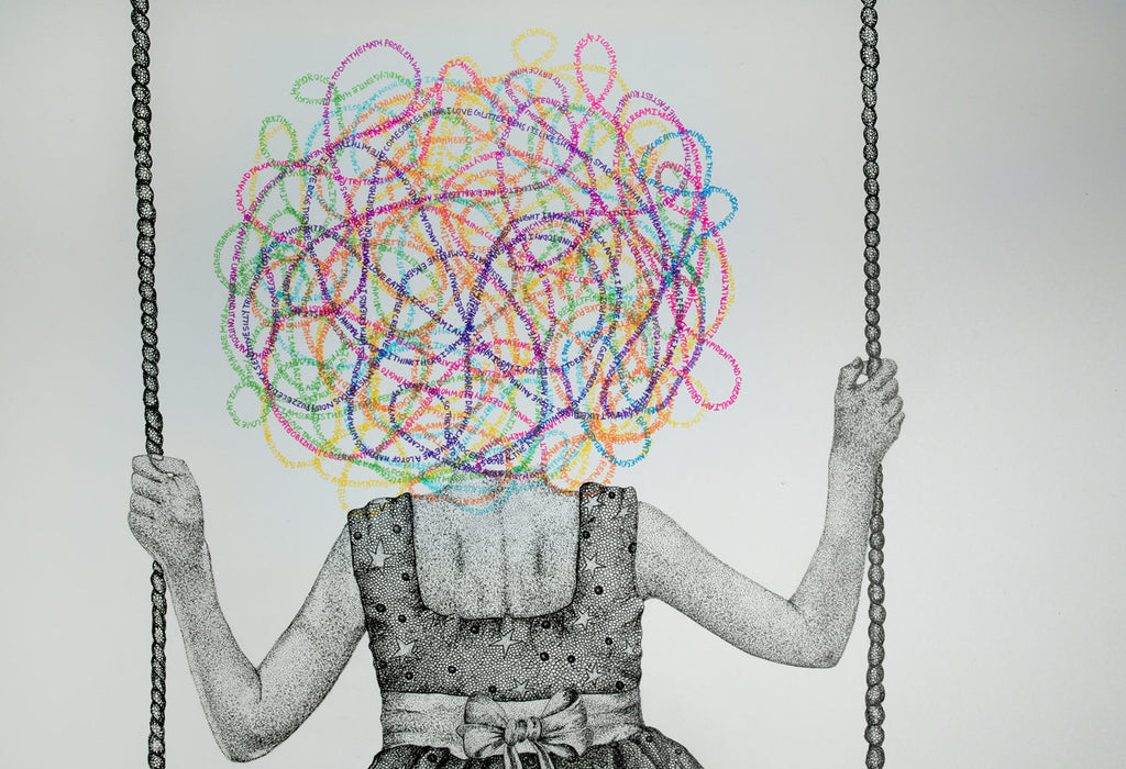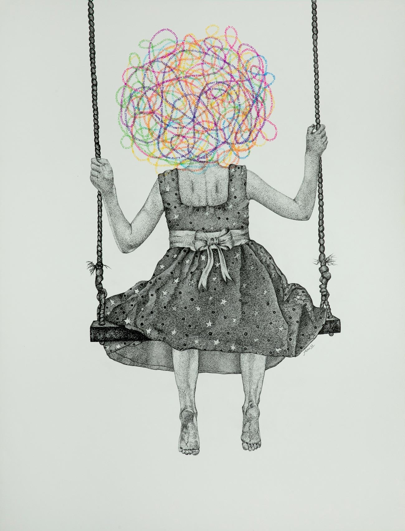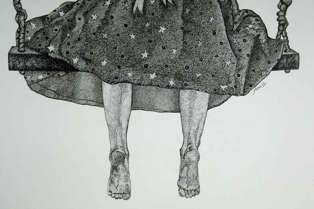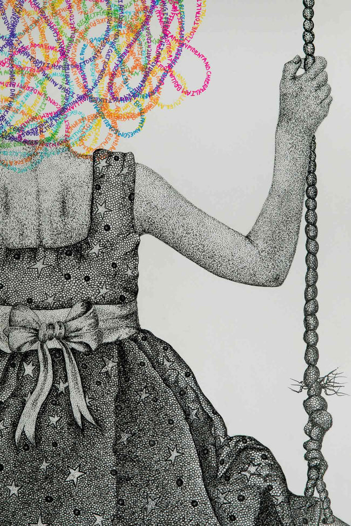 “Childhood” depicts the internal world of a child when they are at their most calm and contemplative: on a swing. The artwork was born of a free-writing exercise that Ashu conducted with a few children, in which she asked them to write down whatever came to mind. Ashu attempts to reflect the largely positive, but often eccentric thoughts that the children shared, through an explosion of colour that is rarely seen in her artistic practice. In so doing, she hopes to celebrate their creative spirit, and the confident vulnerability with which children share their internal narrative. In addition to a carefully rendered multi-coloured text, the work also sees stippling and circle patterns on the figure.