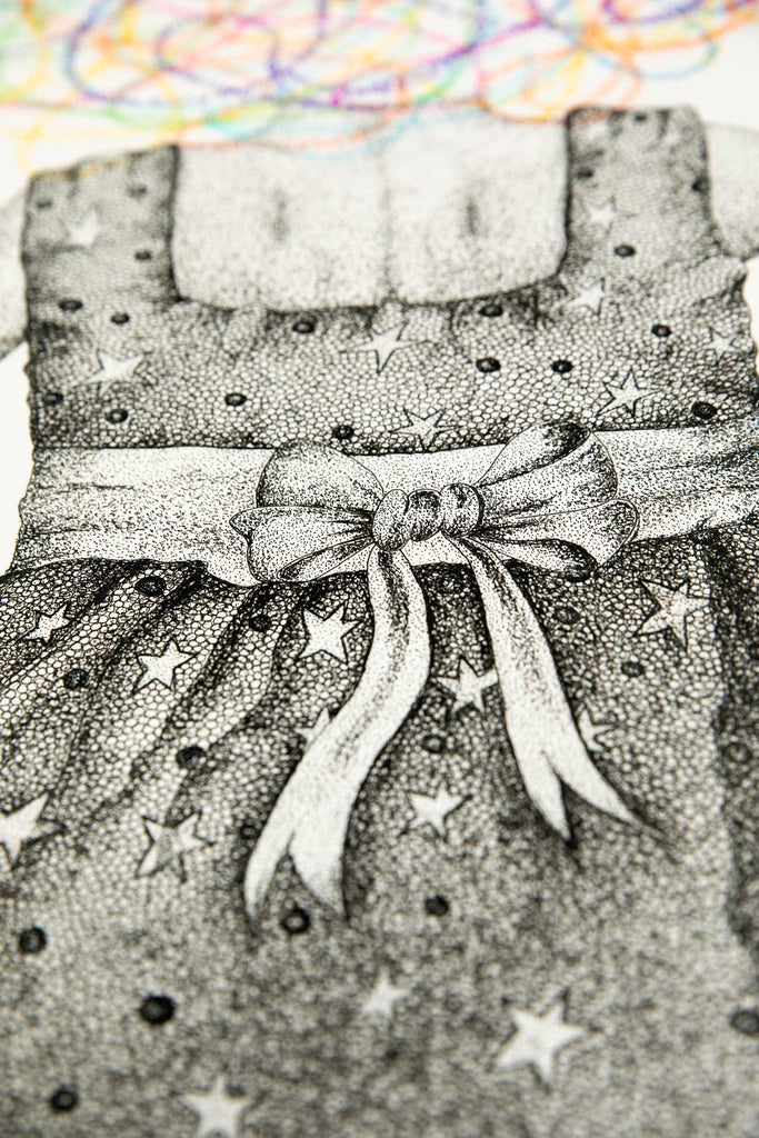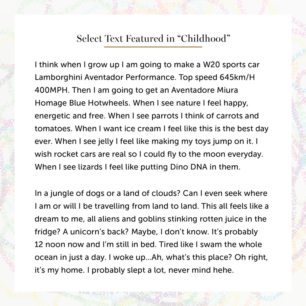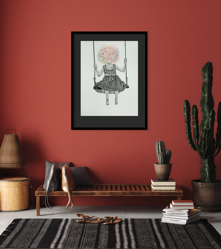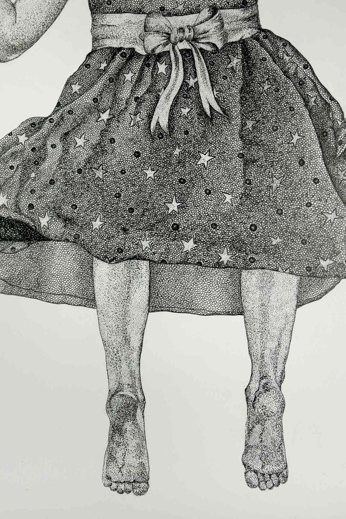 “Childhood” depicts the internal world of a child when they are at their most calm and contemplative: on a swing. The artwork was born of a free-writing exercise that Ashu conducted with a few children, in which she asked them to write down whatever came to mind. Ashu attempts to reflect the largely positive, but often eccentric thoughts that the children shared, through an explosion of colour that is rarely seen in her artistic practice. In so doing, she hopes to celebrate their creative spirit, and the confident vulnerability with which children share their internal narrative. In addition to a carefully rendered multi-coloured text, the work also sees stippling and circle patterns on the figure.