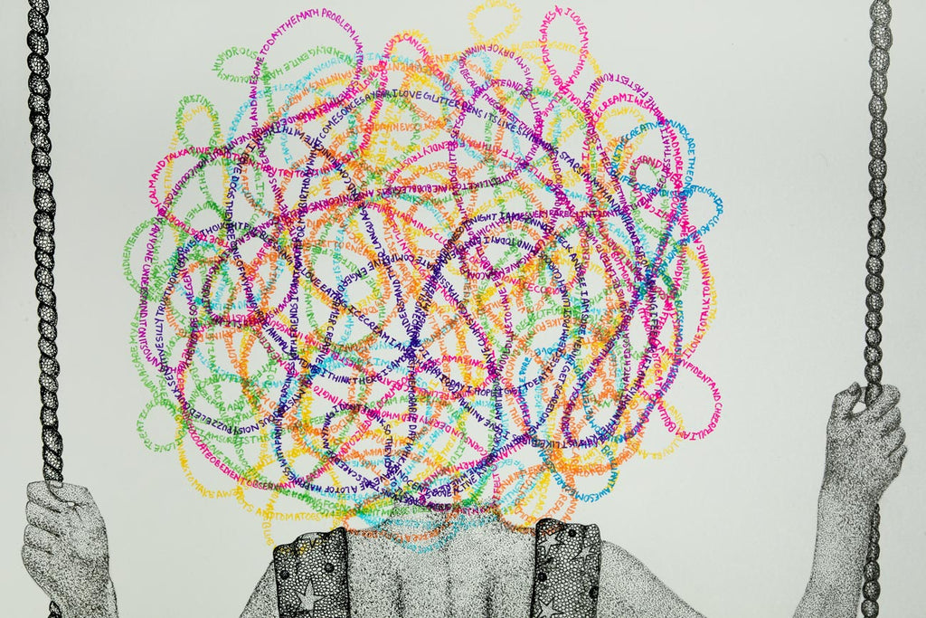 “Childhood” depicts the internal world of a child when they are at their most calm and contemplative: on a swing. The artwork was born of a free-writing exercise that Ashu conducted with a few children, in which she asked them to write down whatever came to mind. Ashu attempts to reflect the largely positive, but often eccentric thoughts that the children shared, through an explosion of colour that is rarely seen in her artistic practice. In so doing, she hopes to celebrate their creative spirit, and the confident vulnerability with which children share their internal narrative. In addition to a carefully rendered multi-coloured text, the work also sees stippling and circle patterns on the figure. -