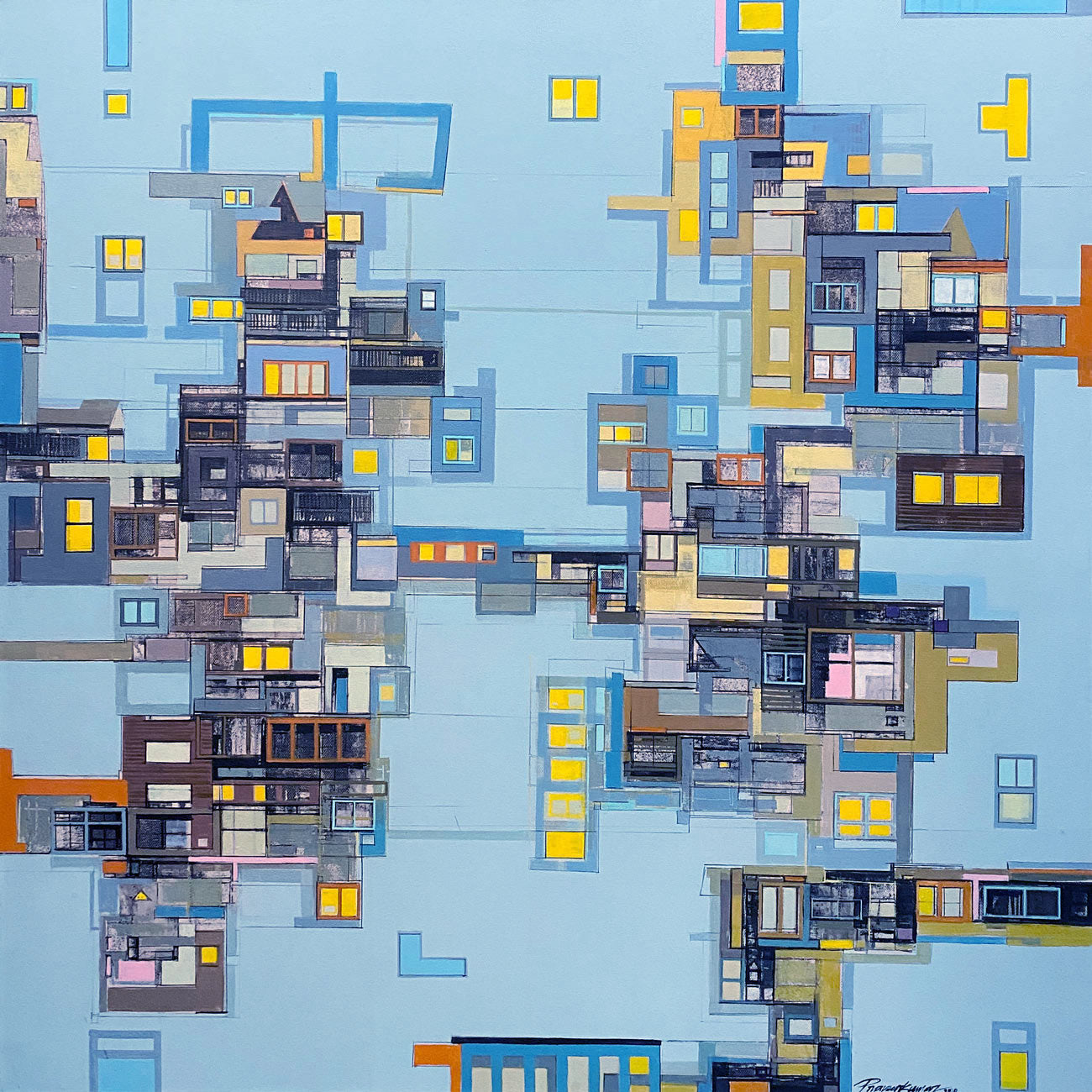 Praveen is best known for his striking abstract depictions of cities. His unusual cityscapes are still and meditative, composed of enigmatic architectural forms that are characters in their own right. Using a mix of mediums such as acrylic, watercolour, pen and ink, and charcoal, his paintings depict urban landscapes in geometric configurations, that are rich in colour and movement. For the artist, cities, with their own sighs, noise, chaos and chatter, are metaphors for the human condition.