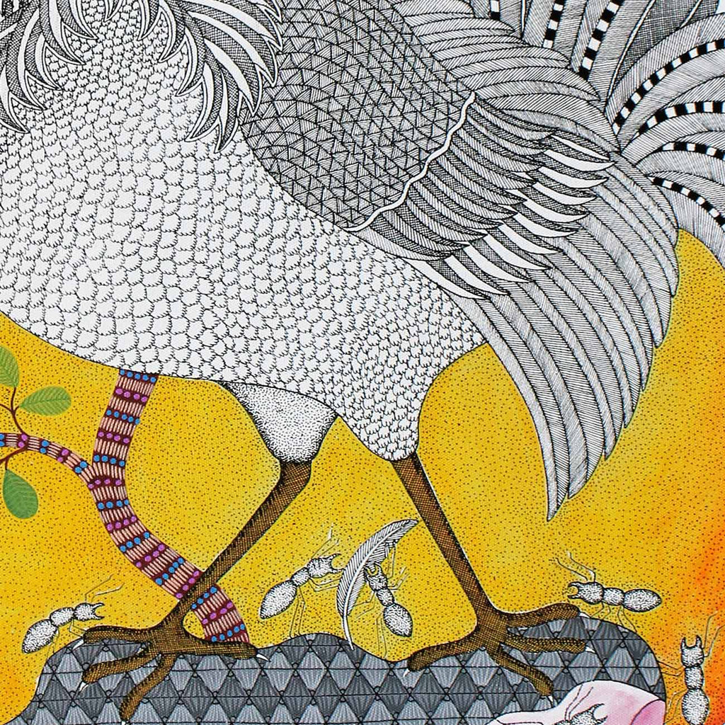 For the Gond, everything is intimately connected to nature, and Gond paintings feature motifs that depict their beliefs and rituals, life in the village, and man’s remarkable relationship with nature. Renowned for their vibrant colours and imaginative use of lines and dots, Gond artworks today are made using natural colours sourced from soil, plants, charcoal and cow dung, as well as acrylic paints.