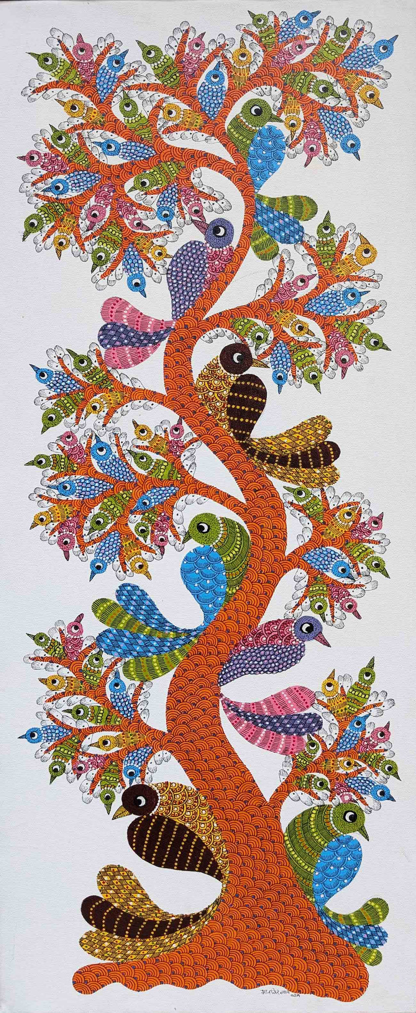Jangarh Singh Shyam was India’s most noted Gond artist, who passed away in 2001. Several members of his family are renowned Gond artists, including his wife, Nankusia Shyam, children Mayank Shyam and Japani Shyam, brother in law Subhash Vyam and his wife, Durga Bai.