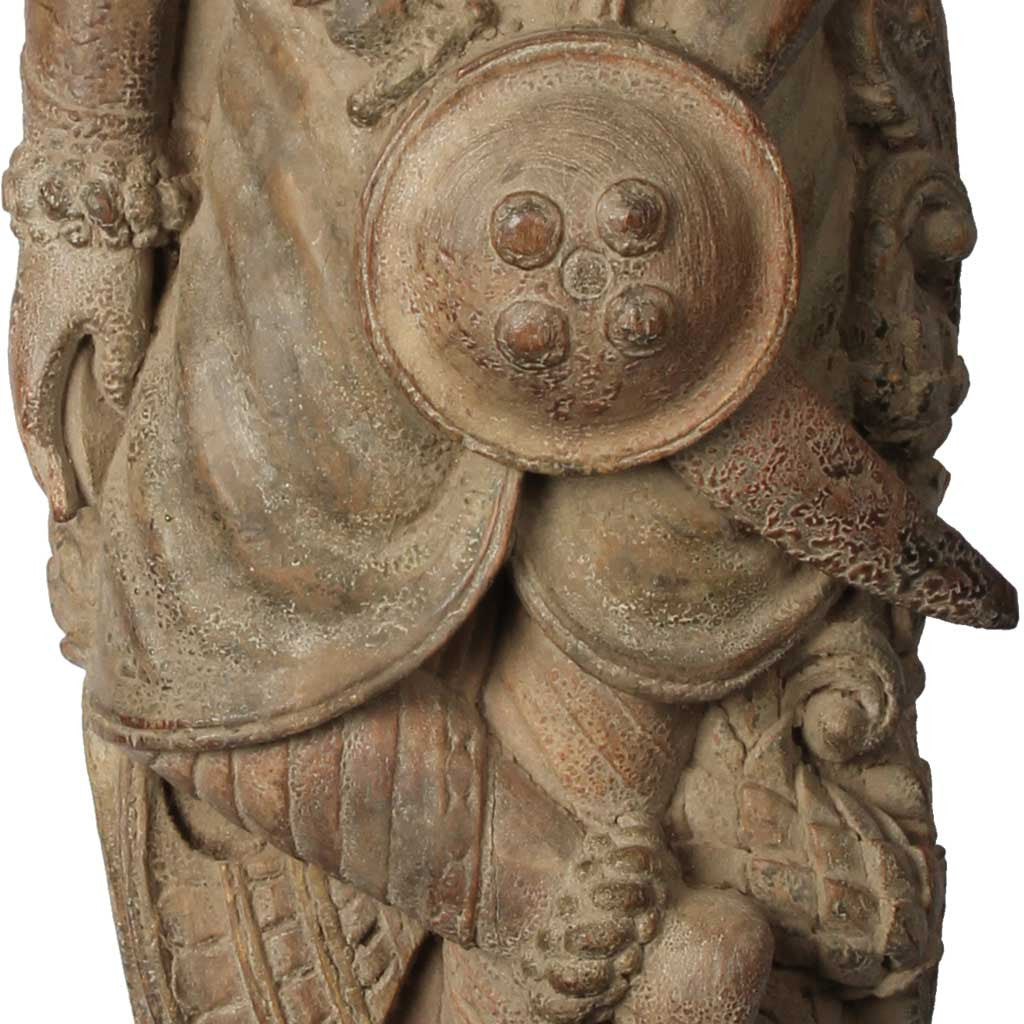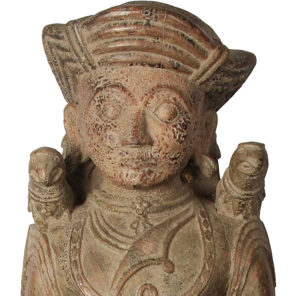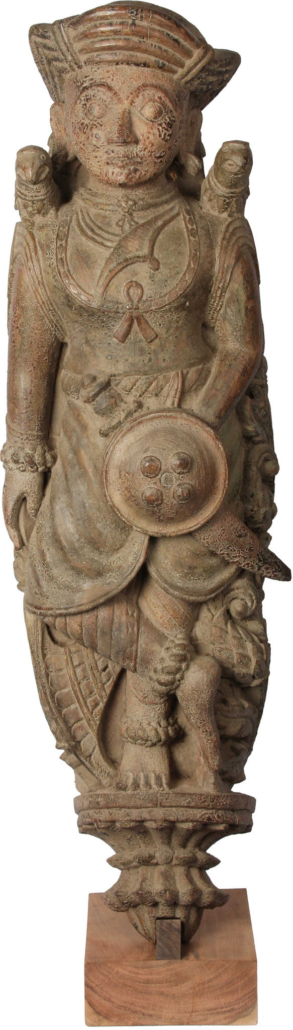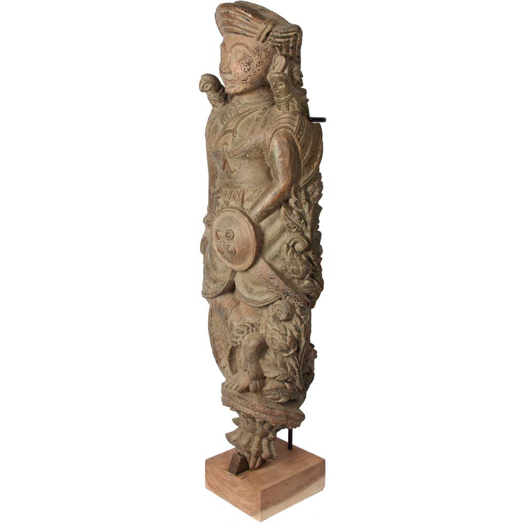 This old bracket, depicting a man with a shield and sword, signals that he is likely to be a sentinel or a guard. From Gujarat, this intricately and exquisitely carved bracket would have been used as a decorative architectural element. The piece is in good condition, with some wear on the face. The bracket is mounted on a wooden base.