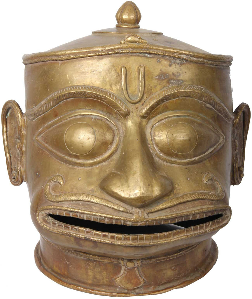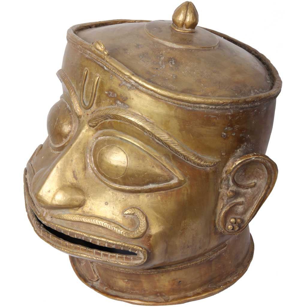 This striking head of Hanuman, is an old find from North Karnataka. Hanuman is worshipped in Hinduism, as an ardent devotee of Lord Rama. One of the stories explaining the name Hanuman, suggest that it means 'one with a prominent or disfigured jaw', as can be seen in this rare collectible.