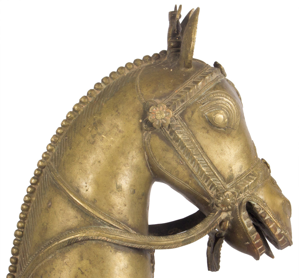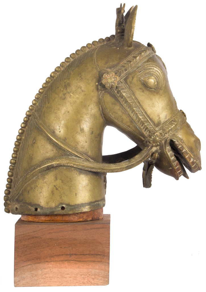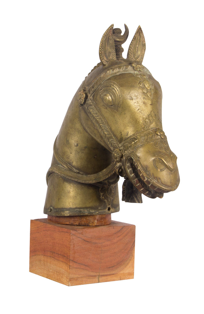 Read MoreThis stunning head of a horse is a rare and interesting find for the avid collector. Made of brass, the head is mounted on a wooden base. A display of excellent craftsmanship, the head is complete with intricate details like the bridle, reins and a crescent moon between the ears. Originally from South India, it would have most likely been part of a vahana (mount or vehicle) of a god. There is a small chip on one side of the crescent moon between the ears, otherwise, the piece is in good condition.