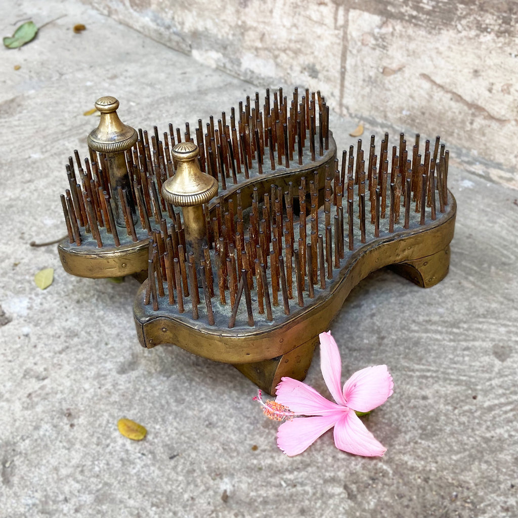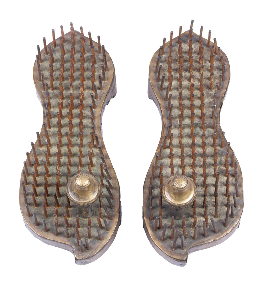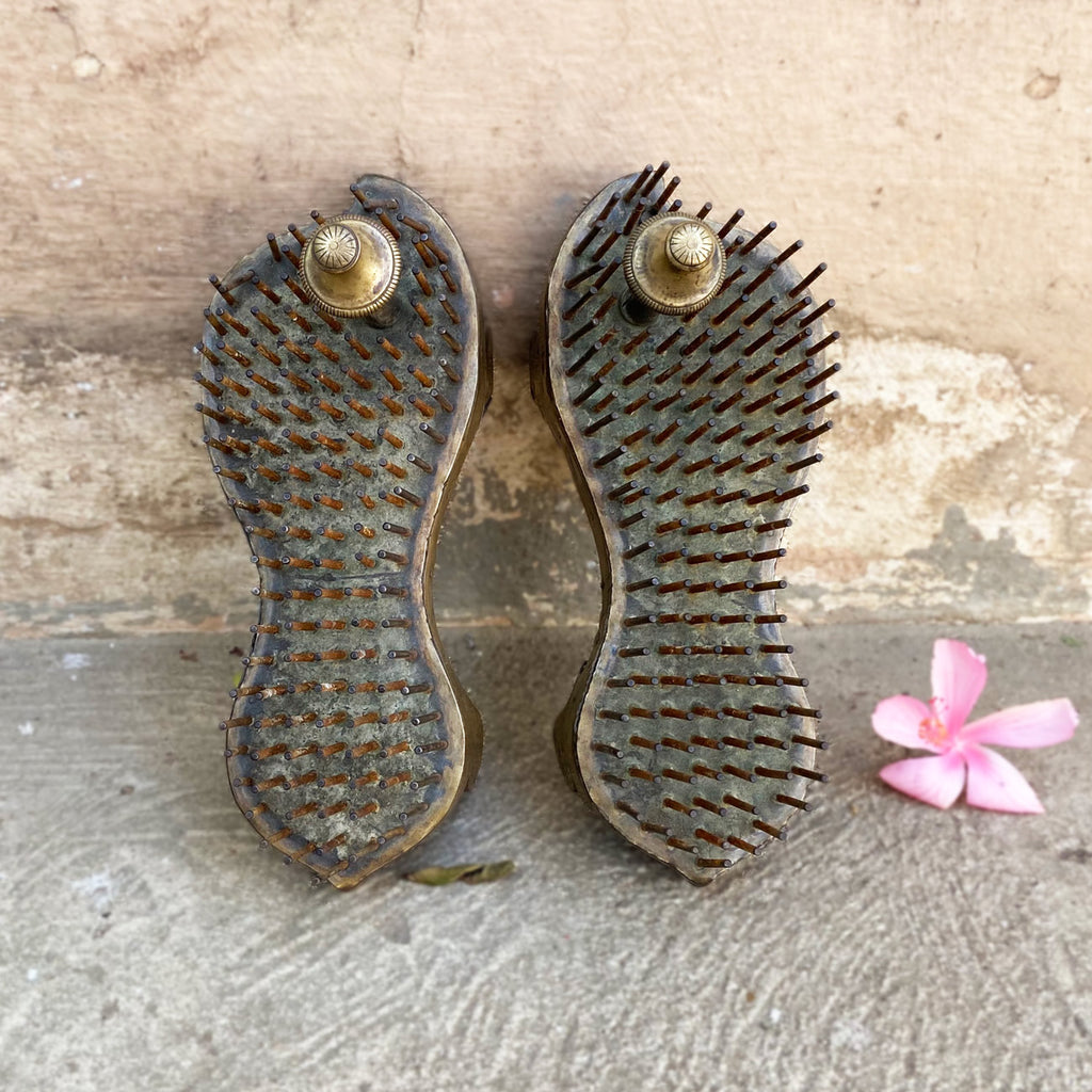 This exquisite pair of Khadau slippers, crafted in wood and metal, is from southern India and dates back to the 19th century. Known as acupressure Khadaus, these are designed for the treatment of foot-related medical conditions and have other health benefits, as well. The pressure points – metal nails in this pair of Khadaus – help relieve pain and improve overall health.