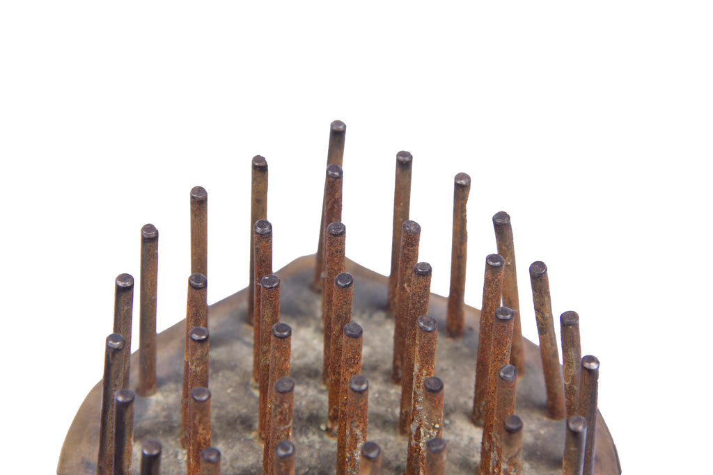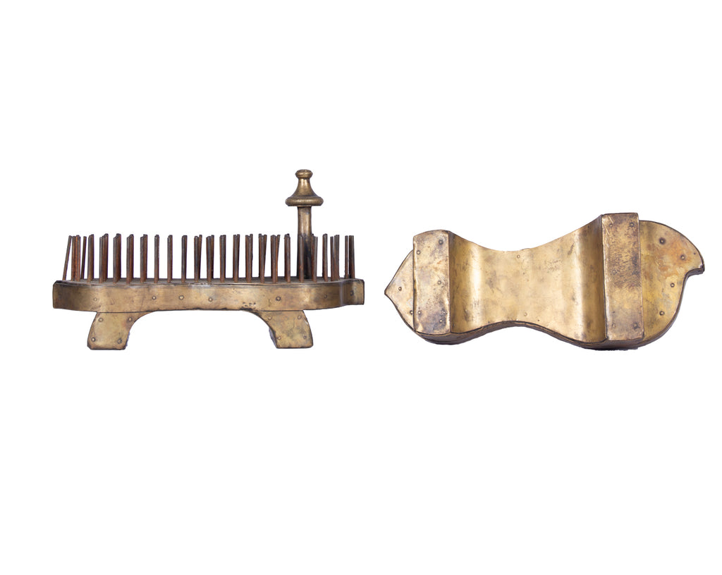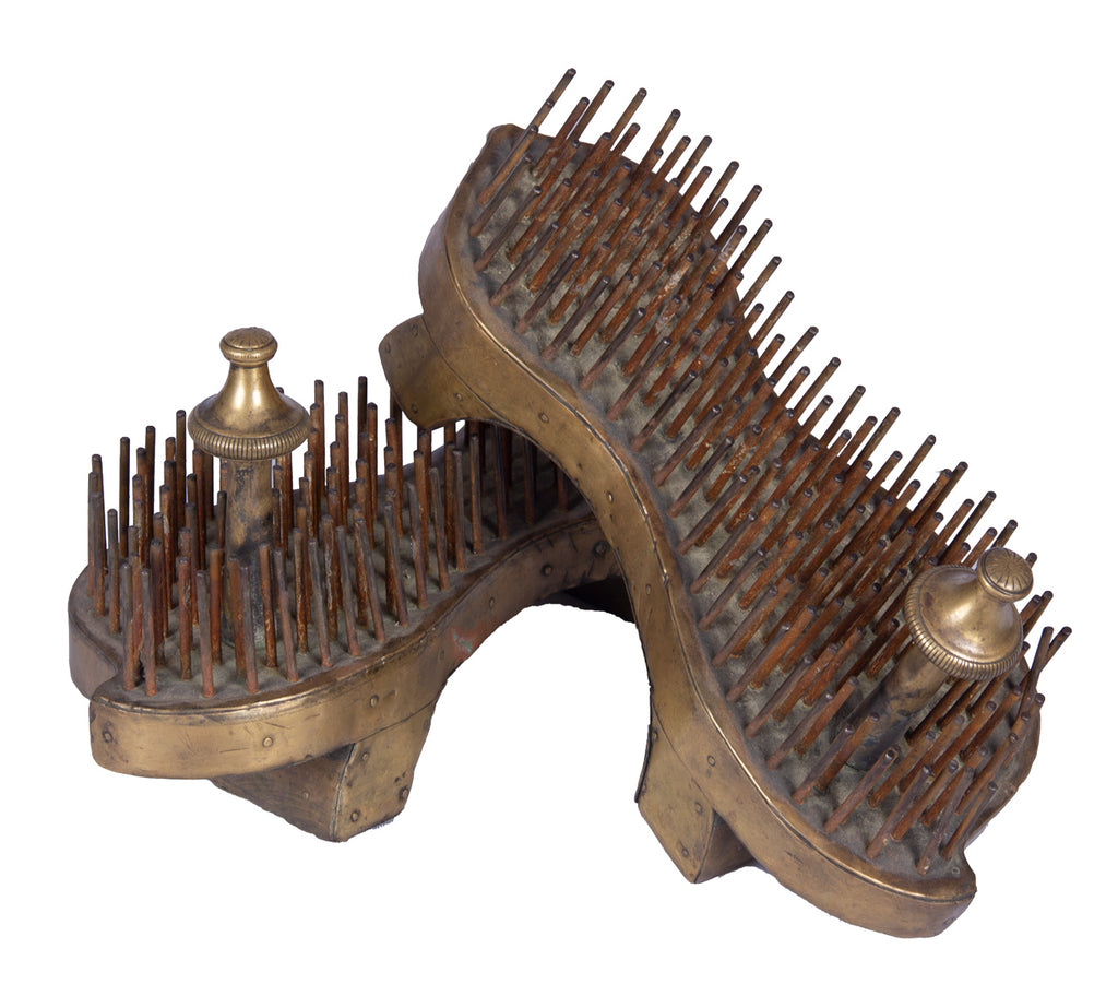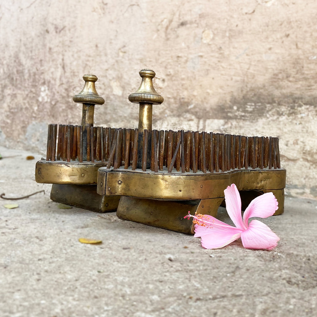 This exquisite pair of Khadau slippers, crafted in wood and metal, is from southern India and dates back to the 19th century. Known as acupressure Khadaus, these are designed for the treatment of foot-related medical conditions and have other health benefits, as well. The pressure points – metal nails in this pair of Khadaus – help relieve pain and improve overall health.