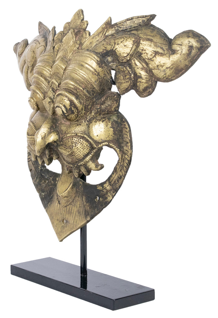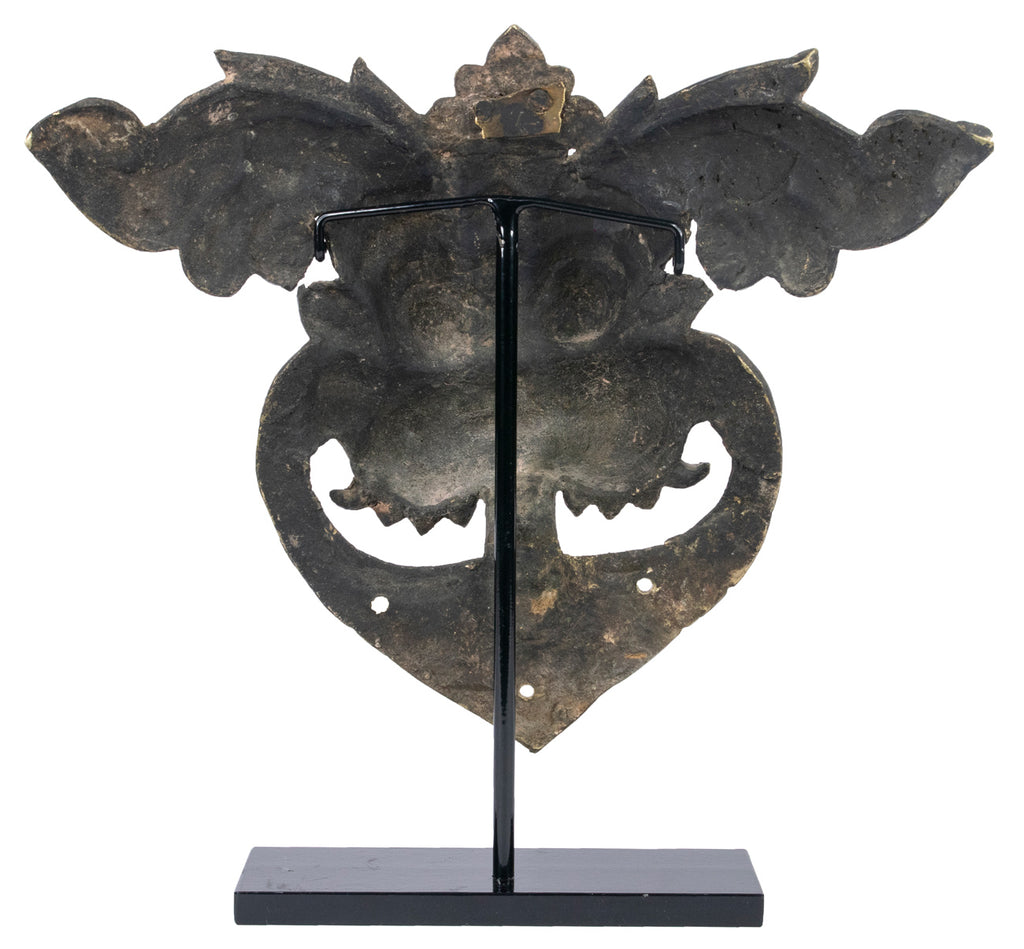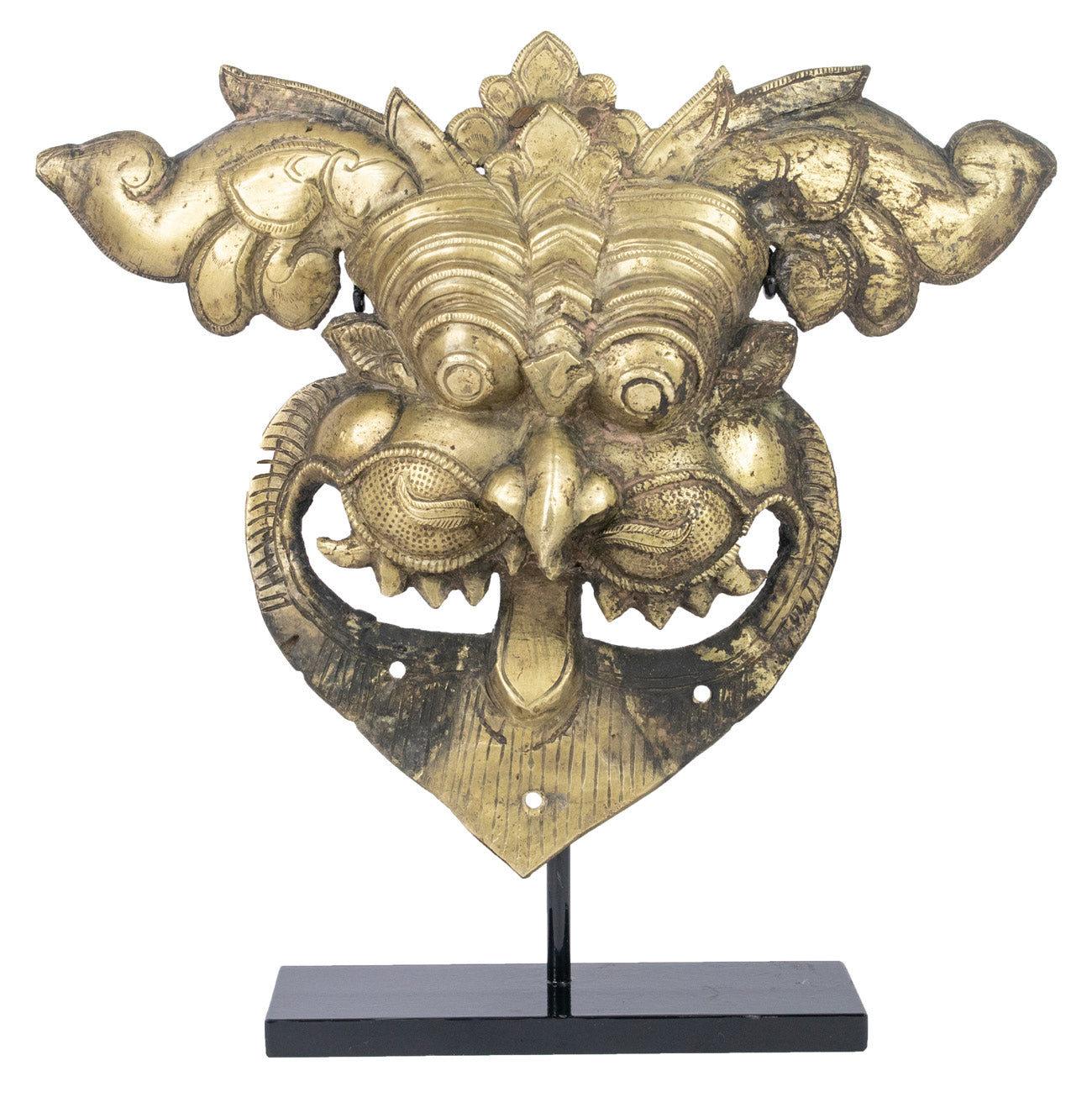 Read MoreThis is a brass, lost-wax cast figure of the all consuming Kirtimukha from South India. The Kirtimukha or 'Face of Glory' is a ferocious monster face with protruding eyes, huge fangs and gaping mouth who is a protector deity, a guardian warding off all evils. Kirtimukha serves primarily as a gruesome, awe-inspiring guardian of the threshold. This would probably have been at the top of a prabhavali (the protective arch around the idol).