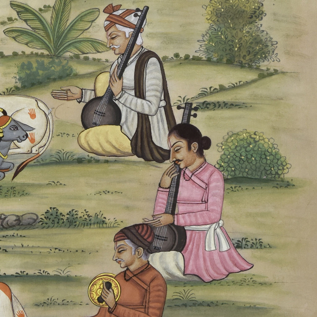 The word Pichwai comes from 'pichh' meaning back, and 'wai', meaning textile hanging. They are made by members of the Pushti Marg sect, founded by Shri Vallabhacharya in the 16th Century. Originally, pichwai paintings were used to decorate the temple of Shrinathji (Shrinathji ki Haveli) in Nathdwara, hung behind the deity to celebrate different seasons, festivals and events in Lord Krishna's life. Over time, pichwais also found a place in the homes of art connoisseurs, owing to their visual appeal. Like several other traditional Indian art forms, the art of Pichwai is also dying, and requires recognition and revival.