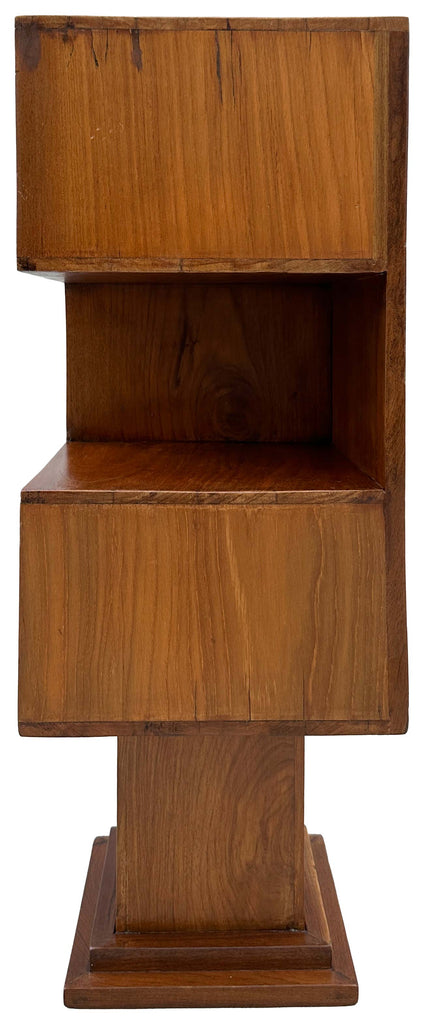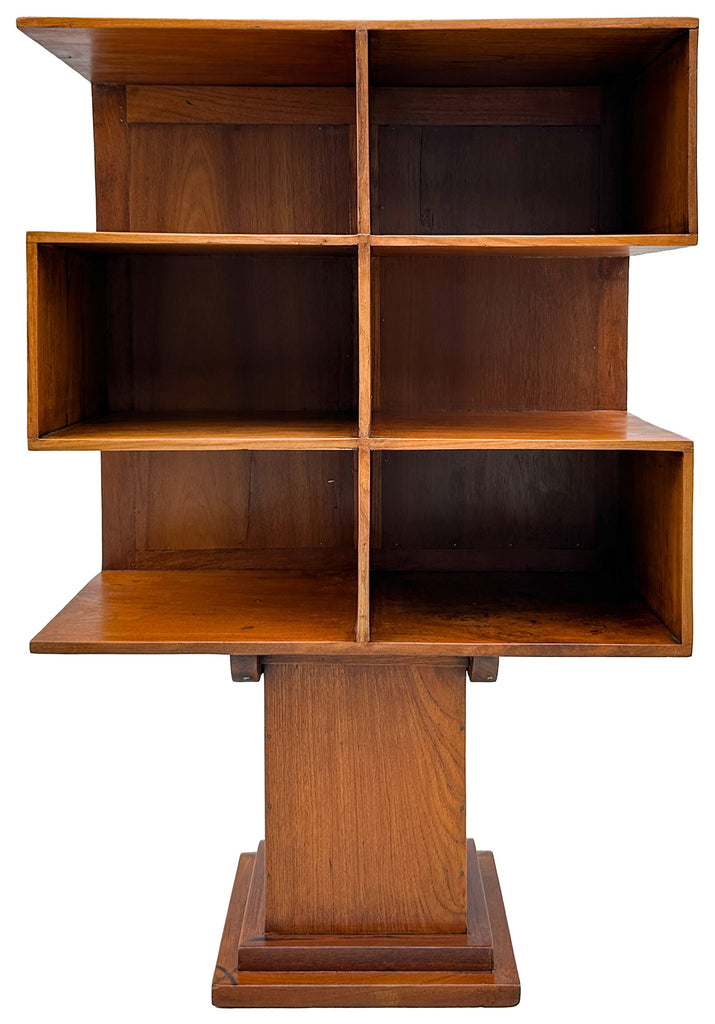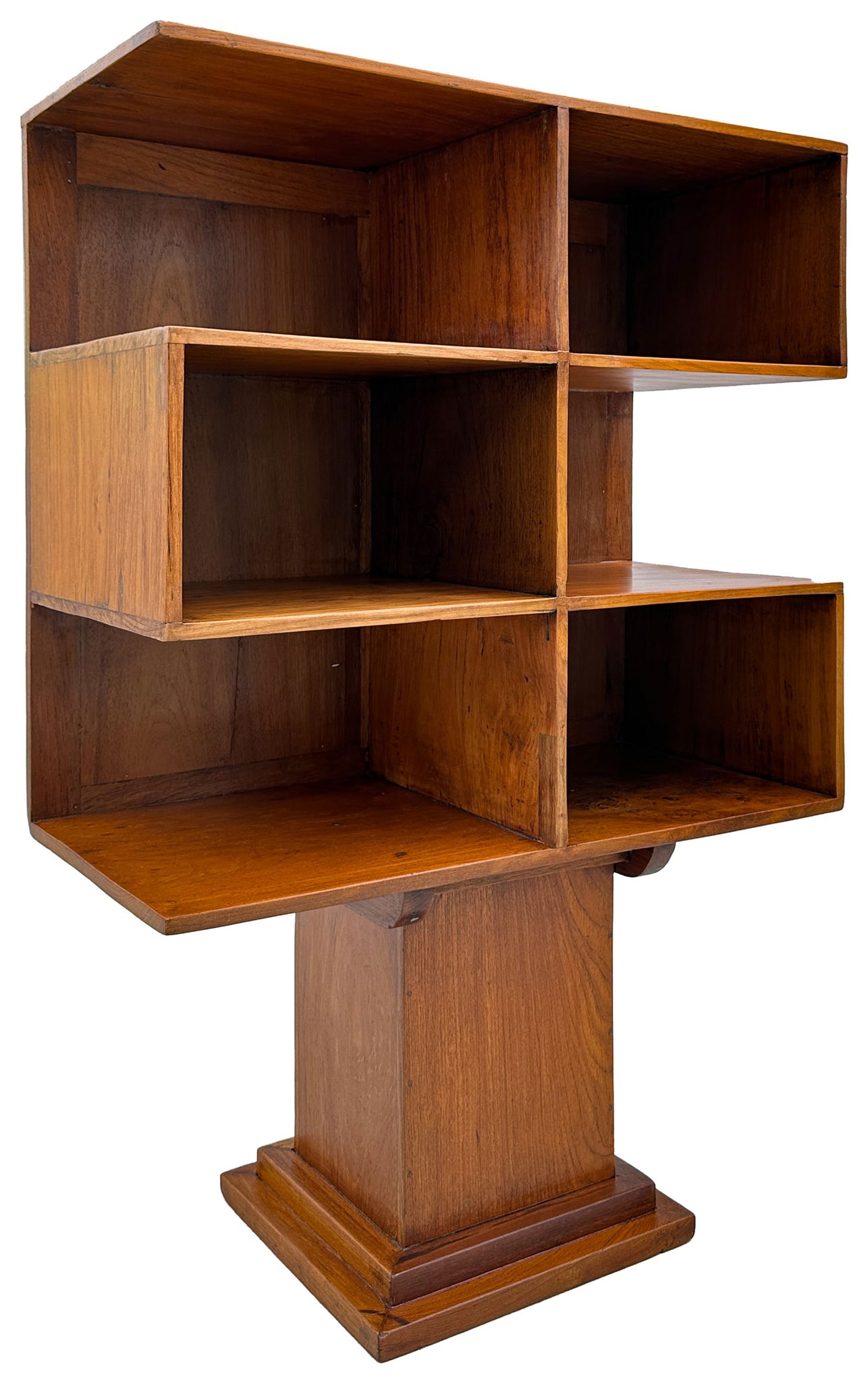 Read MoreRetro postmodern teak shelf from the 1960s/70s. The shelf’s geometric shapes are reminiscent of Mid-century Modern or Scandinavian design, but the asymmetrical arrangement of the shelves is more Postmodern. Postmodern design often plays with form and function, sometimes in unexpected ways.