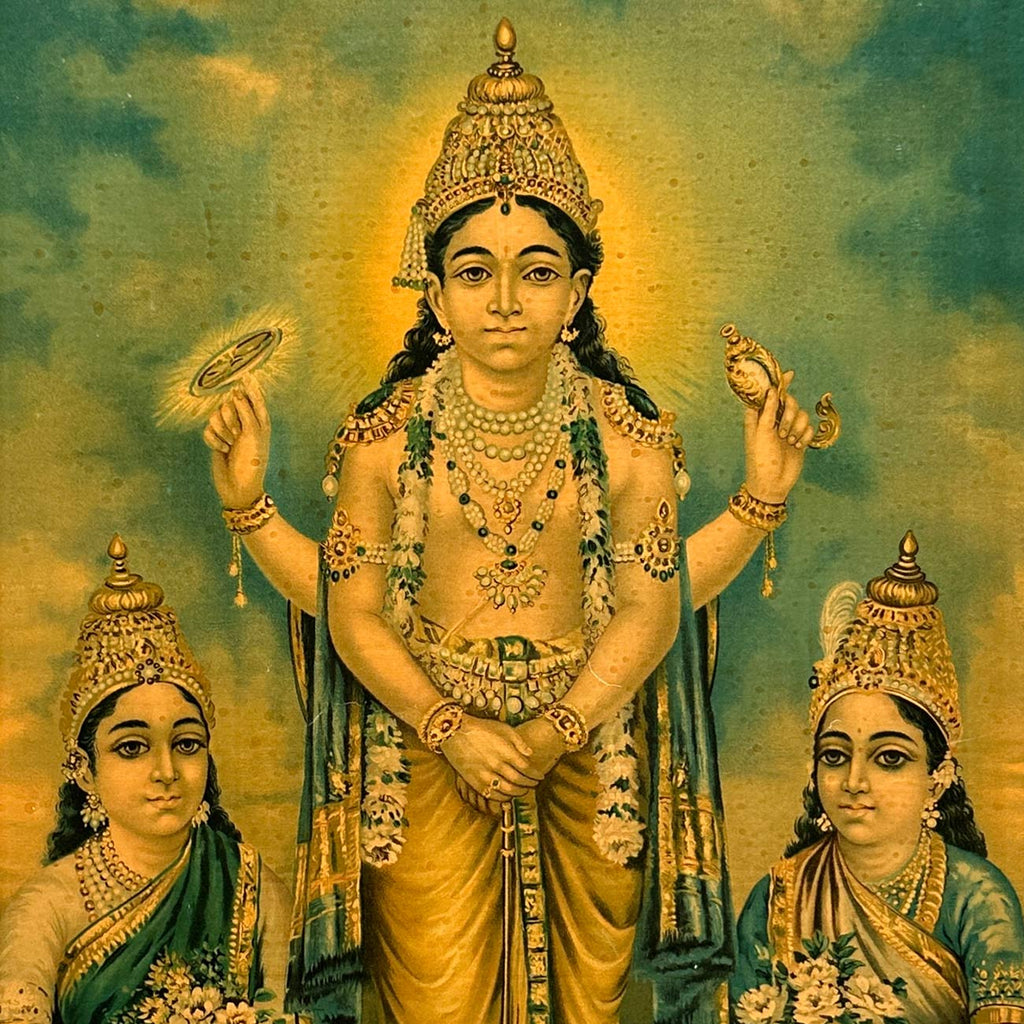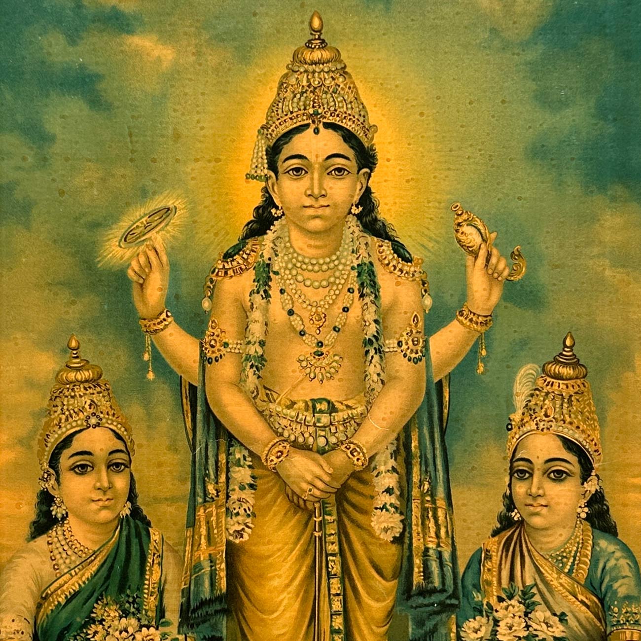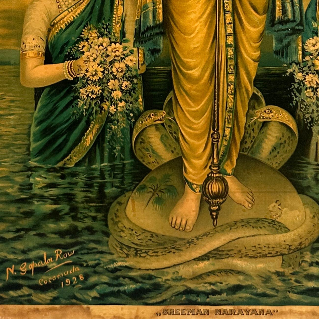 Oleograph of “Sreeman Narayana” (Vishnu and Consorts) signed and dated 1928 by the artist N. Gopala Rao (written as Row). In this avatar, Vishnu is the sustainer of the universe and occasionally descends to earth assuming various forms (avatars) to redress the balance between good and evil; and is hence known as the preserver. He is shown standing on the coils of the snake Ananta, the symbol of eternity, and floating on the waters of the ocean, representing the unmanifested state of the cosmos before creation. He is depicted wearing a bejewelled crown and adorned with necklaces and bracelets of precious stones. He holds in his hands the shankha (conch), the symbol of the five existential elements, the chakra (discus), a symbol of the speed of thought and the gada (mace), a symbol of knowledge and power. Standing on either side of him are his consorts Shridevi and Bhudevi who hold flower bouquets.