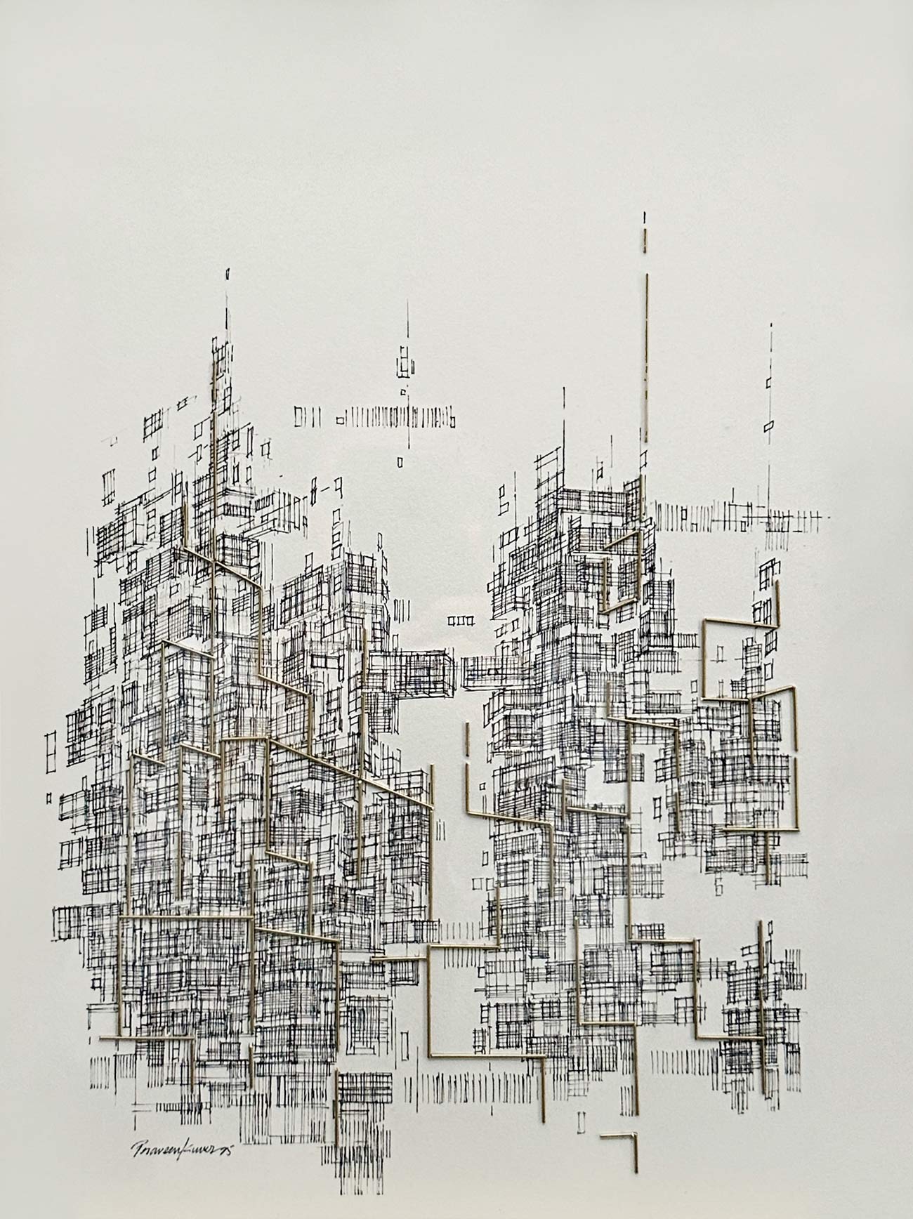 Praveen is best known for his striking abstract depictions of cities. His unusual cityscapes are still and meditative, composed of enigmatic architectural forms that are characters in their own right. Using a mix of mediums such as acrylic, watercolour, pen and ink, and charcoal, his paintings depict urban landscapes in geometric configurations, that are rich in colour and movement. For the artist, cities, with their own sighs, noise, chaos and chatter, are metaphors for the human condition.