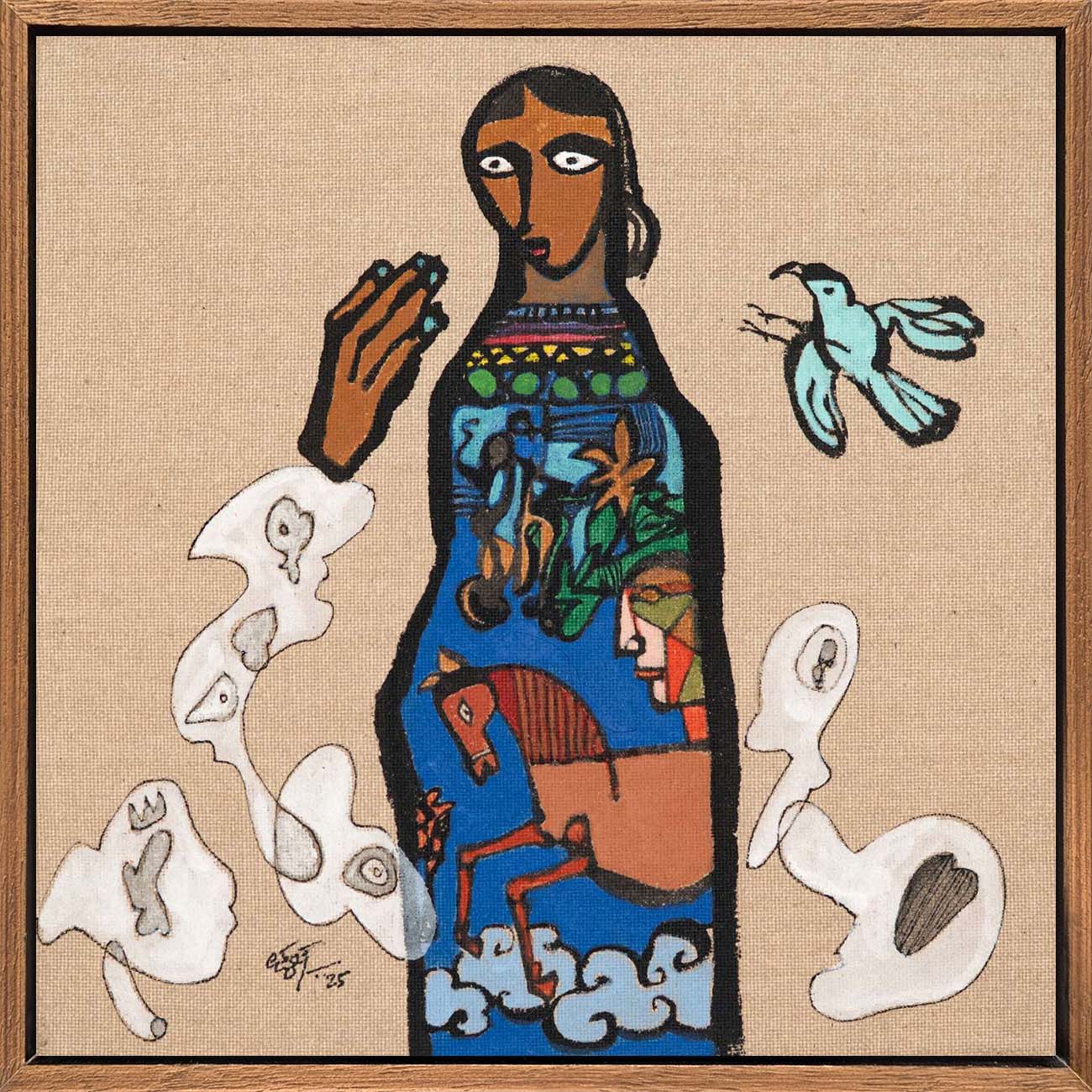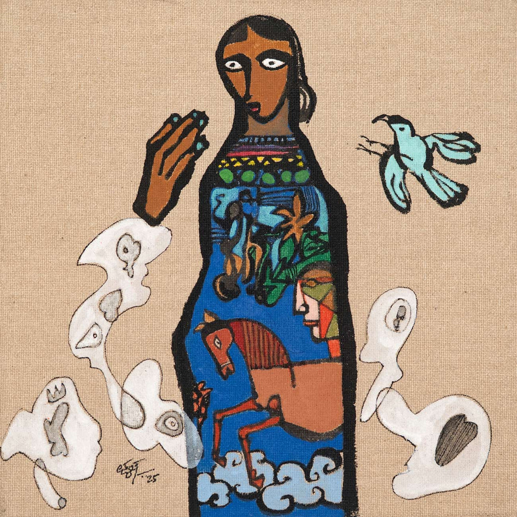 This artwork is part of the Sixty@60 series of artworks by Laxman Aelay. The series, marking the year in which Laxman Aelay turned 60, comprises of sixty lyrical, dreamlike fragments rendered in ink, pigment and textured lines, that inevitably translate absence into substance, and nothing into everything, in a metaphysical sense. Each work is a pause, a small pocket of time where memory, dream, and myth converge in unexpected ways. There are poetic feelings such as a sudden flash of a bird, a face that flickers between joy and solitude, a landscape dissolving into abstraction. Working on such an intimate scale changes the artist’s rhythm. It invites closeness, making every mark intimate, deliberate, and personal. Some panels hold a single figure or animal, while others weave intricate worlds of foliage, water, and sky. They are fragments of stories that were never fully told, images that hover like verses of a poem, waiting to be seen, heard, and felt.