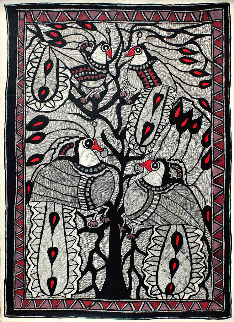Known for its intricate motifs and vibrant colours, Madhubani or Mithila painting is an Indian art form developed by women from the region of Mithila in Northern Bihar. Though practiced for hundreds of years, Madhubani paintings were relatively unknown, and “discovered” only in 1934, when during an inspection after an earthquake, a British colonial officer came across them on the walls of houses.
