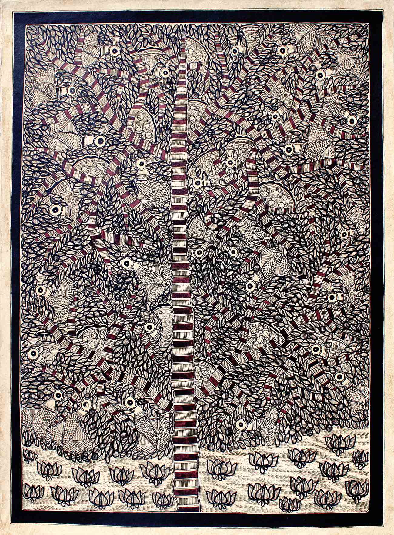 Known for its intricate motifs and vibrant colours, Madhubani or Mithila painting is an Indian art form developed by women from the region of Mithila in Northern Bihar. Though practiced for hundreds of years, Madhubani paintings were relatively unknown, and “discovered” only in 1934, when during an inspection after an earthquake, a British colonial officer came across them on the walls of houses.