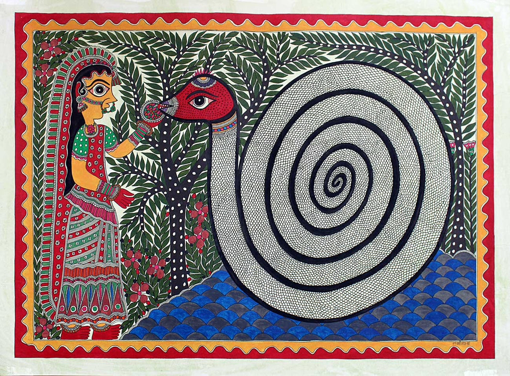 Known for its intricate motifs and vibrant colours, Madhubani or Mithila painting is an Indian art form developed by women from the region of Mithila in Northern Bihar. Though practiced for hundreds of years, Madhubani paintings were relatively unknown, and “discovered” only in 1934, when during an inspection after an earthquake, a British colonial officer came across them on the walls of houses.