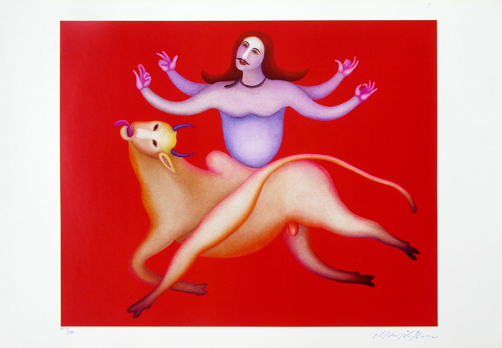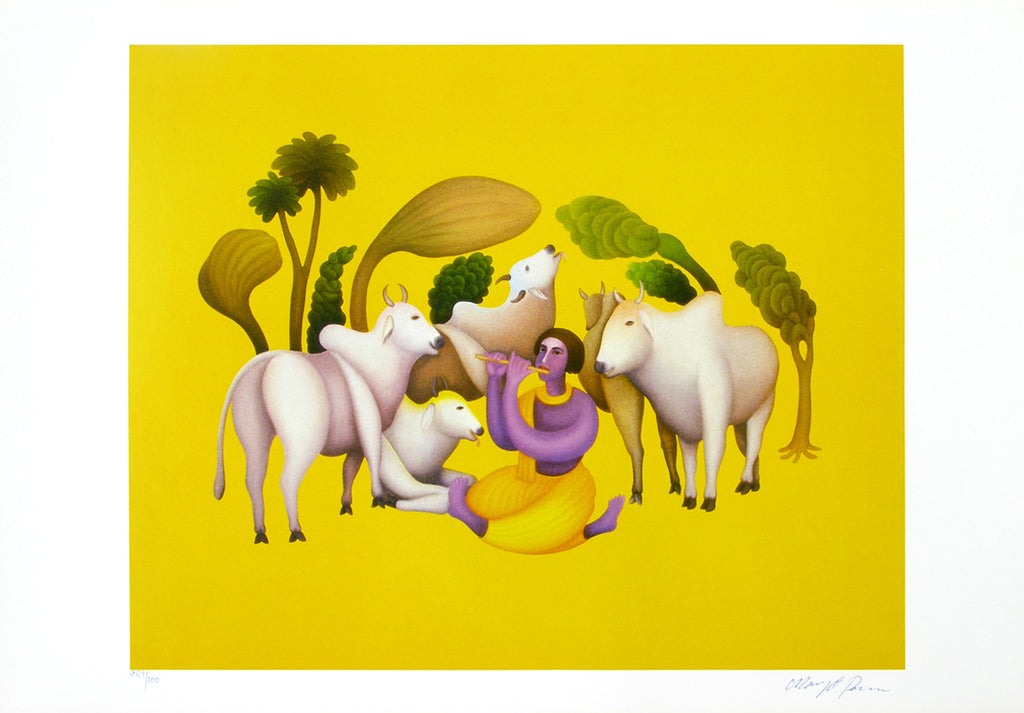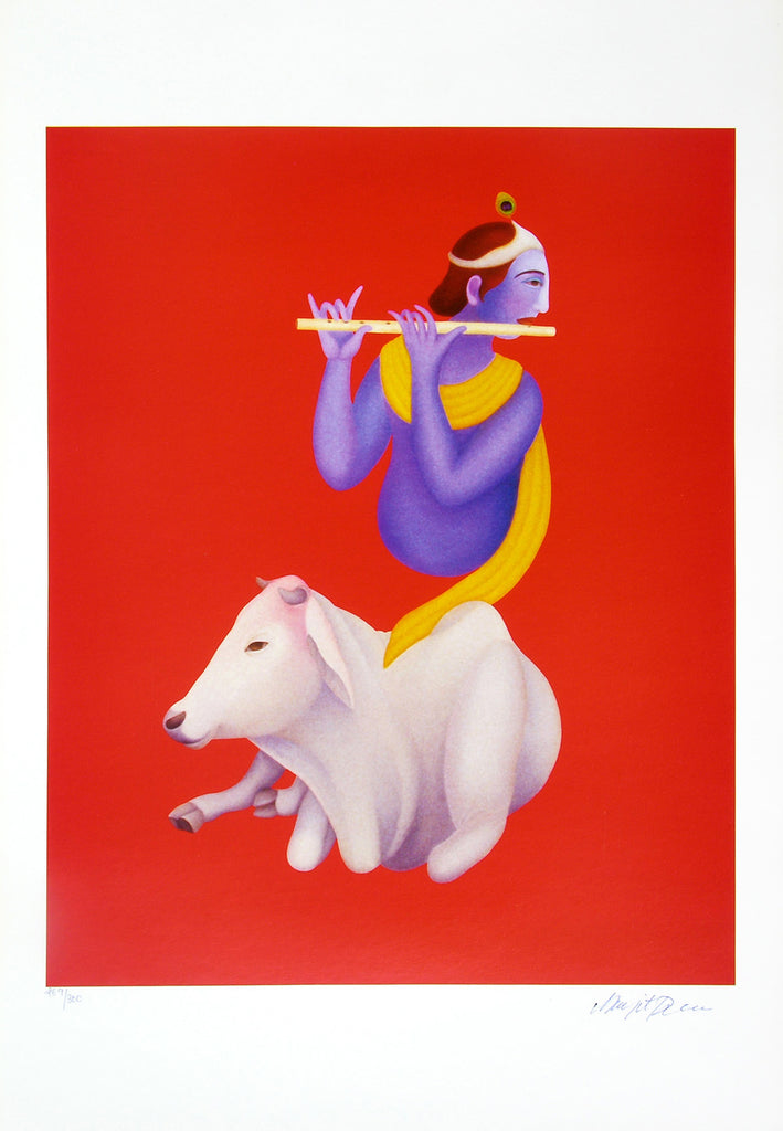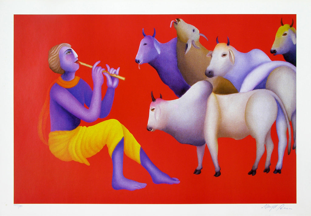 In 1972, he returned to India. Rejecting European influences, Manjit Bawa was one of the few artists of his time who used distinctly Indian colours such as bright pink, red, blue, sunflower yellow, green, and violet. Nature, birds and animals occurred frequently in his paintings, along with mythological characters such as Krishna, Kali and Shiva, and also Ranjha, from the tragic epic Heer Ranjha. Bawa was deeply spiritual and a believer of Sufi philosophy. His crisp, allegorical paintings were featured at Biennales in Japan, Turkey and Cuba. He also participated in many significant group shows in Amsterdam, Singapore, London, Mumbai and Paris.