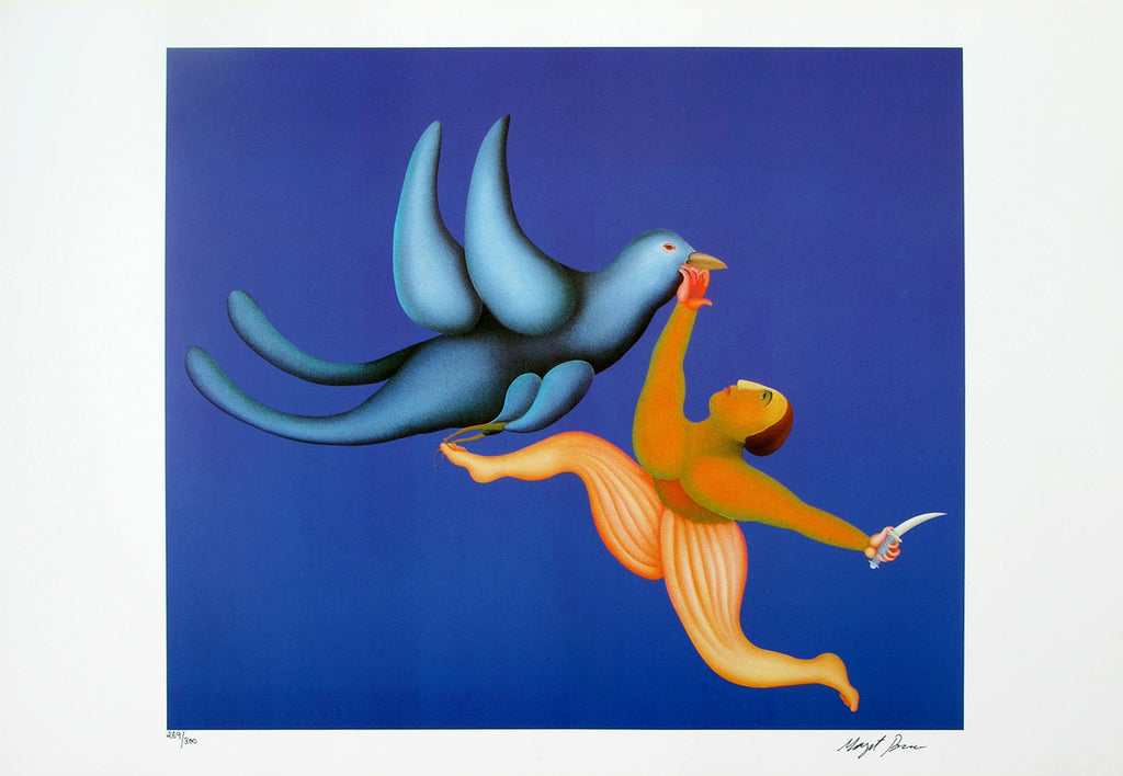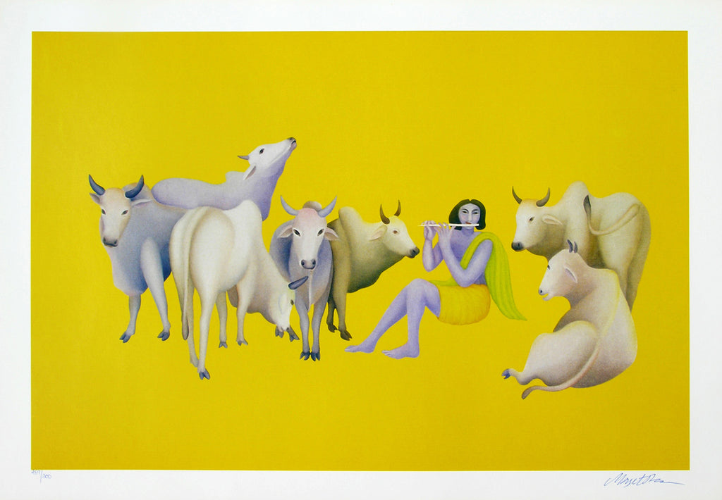 Born in 1941 in Dhuri, Punjab, Manjit Bawa is one of India’s most acclaimed artists. Encouraged heavily by his older brothers to pursue art, Bawa studied at the Delhi College of Art from 1958-1963 under eminent modern artists such as Somnath Hore, Dhanraj Bhagat and B.C. Sanyal. But it was Abani Sen who had a huge influence on Bawa, pushing him towards figurative work when others were leaning towards abstract. Sen made Manjit Bawa sketch constantly, and that practice made him develop his own distinct style, which is recognizable even today. Bawa went to London in 1964 where he worked as a silkscreen printmaker while also studying art. During that time, he managed to land solo exhibitions in London as well as Spain.