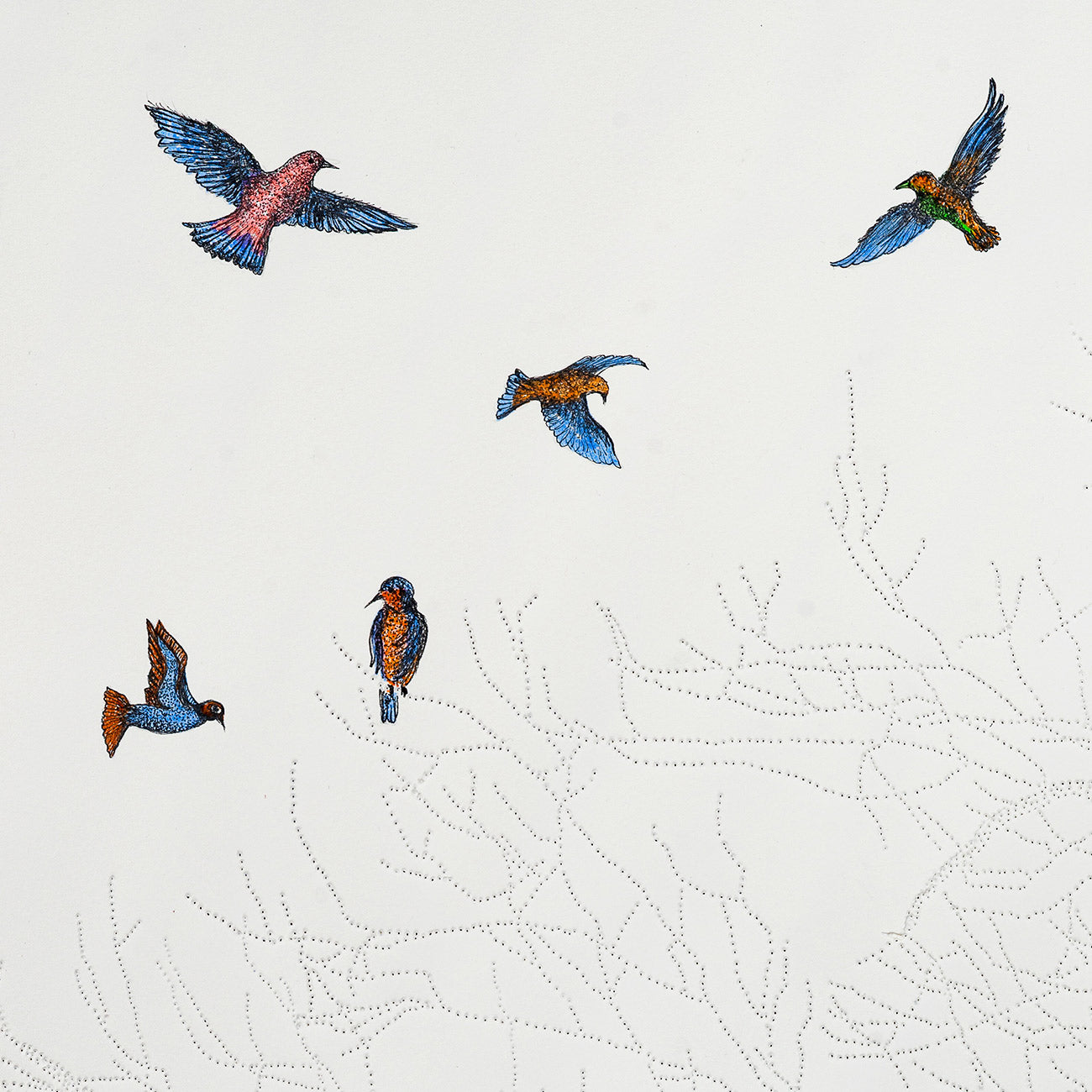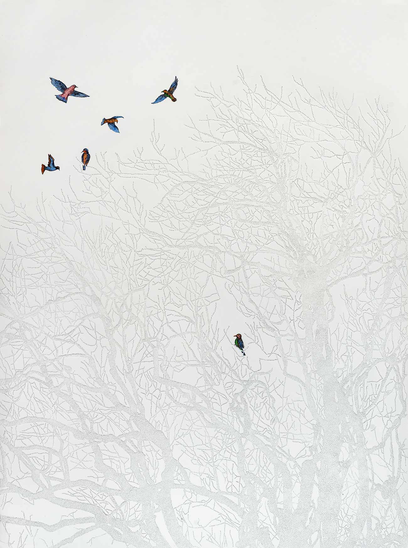 Ashu Gupta is a contemporary artist whose practice is an exercise in introspection. A graduate of the National Institute of Fashion Design in Raipur, Ashu also holds a certificate from London’s Royal College of Art Contemporary Art Summer School. She developed her artistic practice through experimentation with pattern making, allowing intricate motifs to slowly emerge as larger forms. Working predominantly with pen and ink, Ashu uses hundreds of thousands of repeating patterns and stippling in her work. In recent times, she has also incorporated experiments with other techniques such as paper piercing and thread work, in her practice. Ashu’s deeply layered, mostly monochromatic compositions offer the possibility of a new interpretation with every glance. Her subjects are always emphasized, with nothing to distract from the beauty of her stunning pieces.