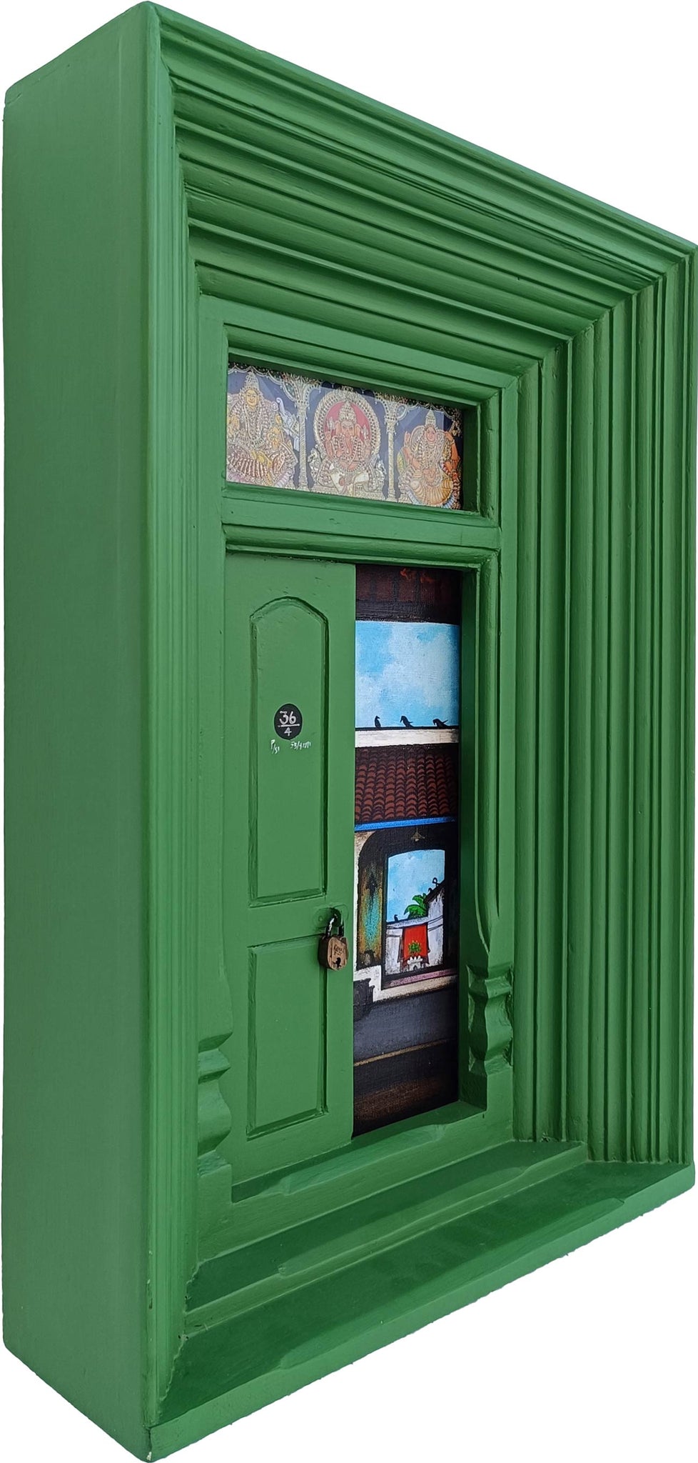 Born in 1977, K.R. Santhana Krishnan is an internationally acclaimed artist, known for his vibrant and intriguing door paintings. Santhana grew up in Edappadi in the Salem district of Tamil Nadu, and completed his Bachelor of Fine Arts from Government College of Fine Arts in Kumbakonam. He then did his Masters in Fine Arts from the Government College of Fine Arts, Chennai.