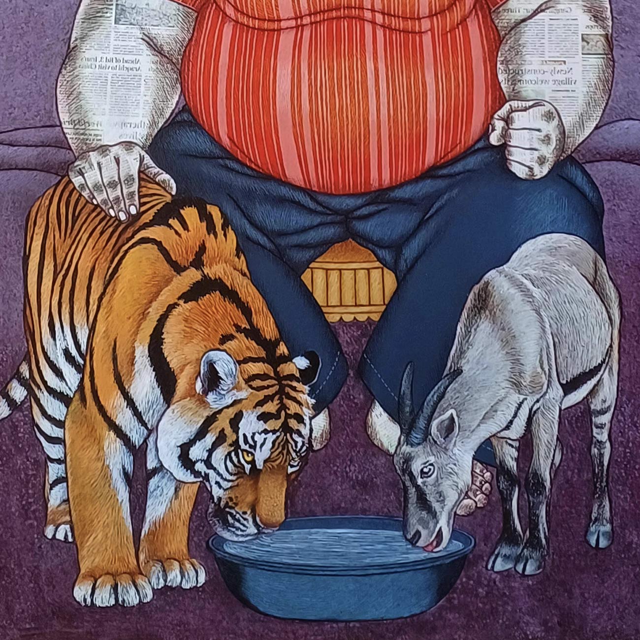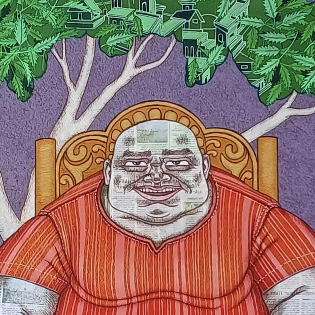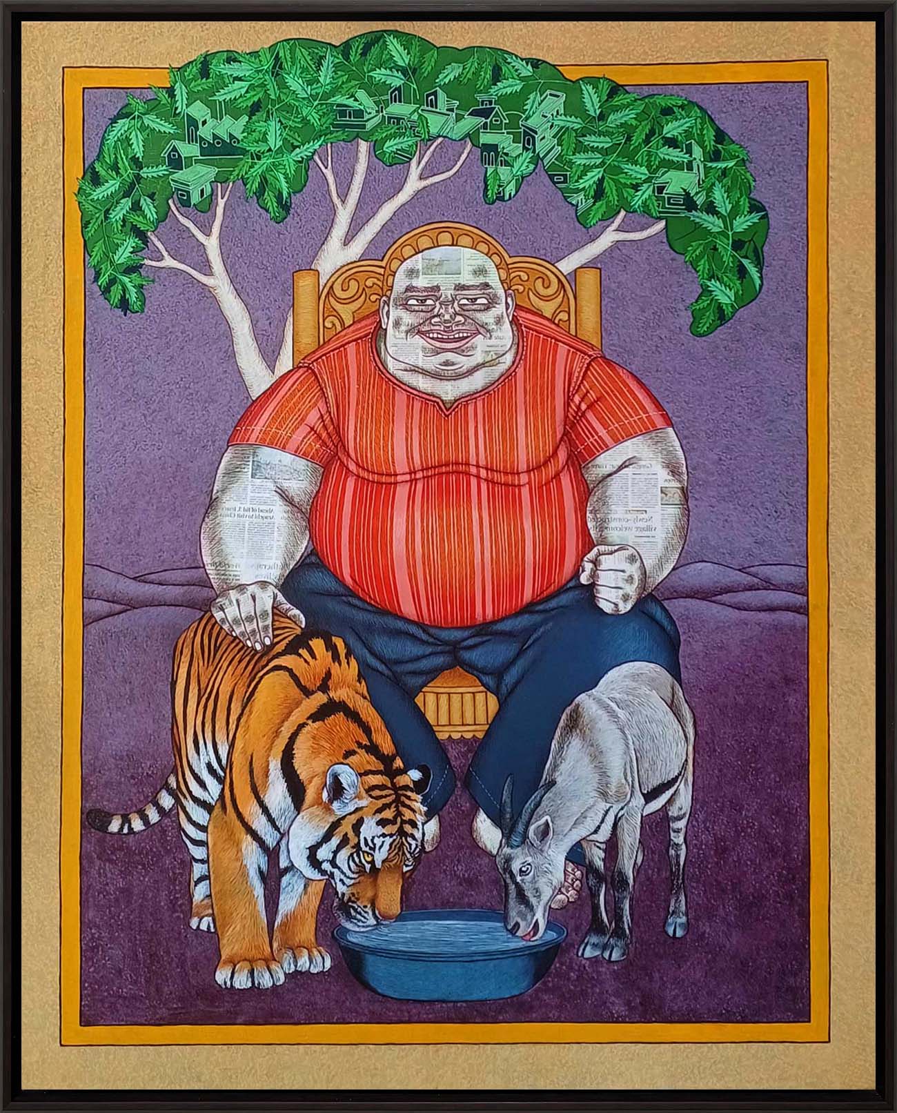 Born in 1979 in West Bengal, Mrinal Dey completed his bachelor’s degree in Fine Arts (BFA) with a specialization in Painting, and his master’s degree (MFA) from Indira Kala Sangeet University, Chhattisgarh, in 2005 and 2007, respectively. Dey’s paintings are a satirical commentary about the self-inflicted trappings of modern life. The central figure, always outsized, symbolizes over-consumption and the acute sense of loneliness caused by consumerism. As the artist confronts the socio-cultural conflicts of our times through his paintings, the central figure is depicted in a manner that is eerily grotesque and yet identifiably human. At the same time, there is a surrealist overtone to his paintings, as dreams seem to flit in and out of the minds of the central figures. These figures, with their cold hard stares, transfix the viewer by sending a jolt of simultaneous awe and repulsion in them. Mrinal Dey, through his evocative art, raises questions about the present-day commodification of almost all people and objects, including art.