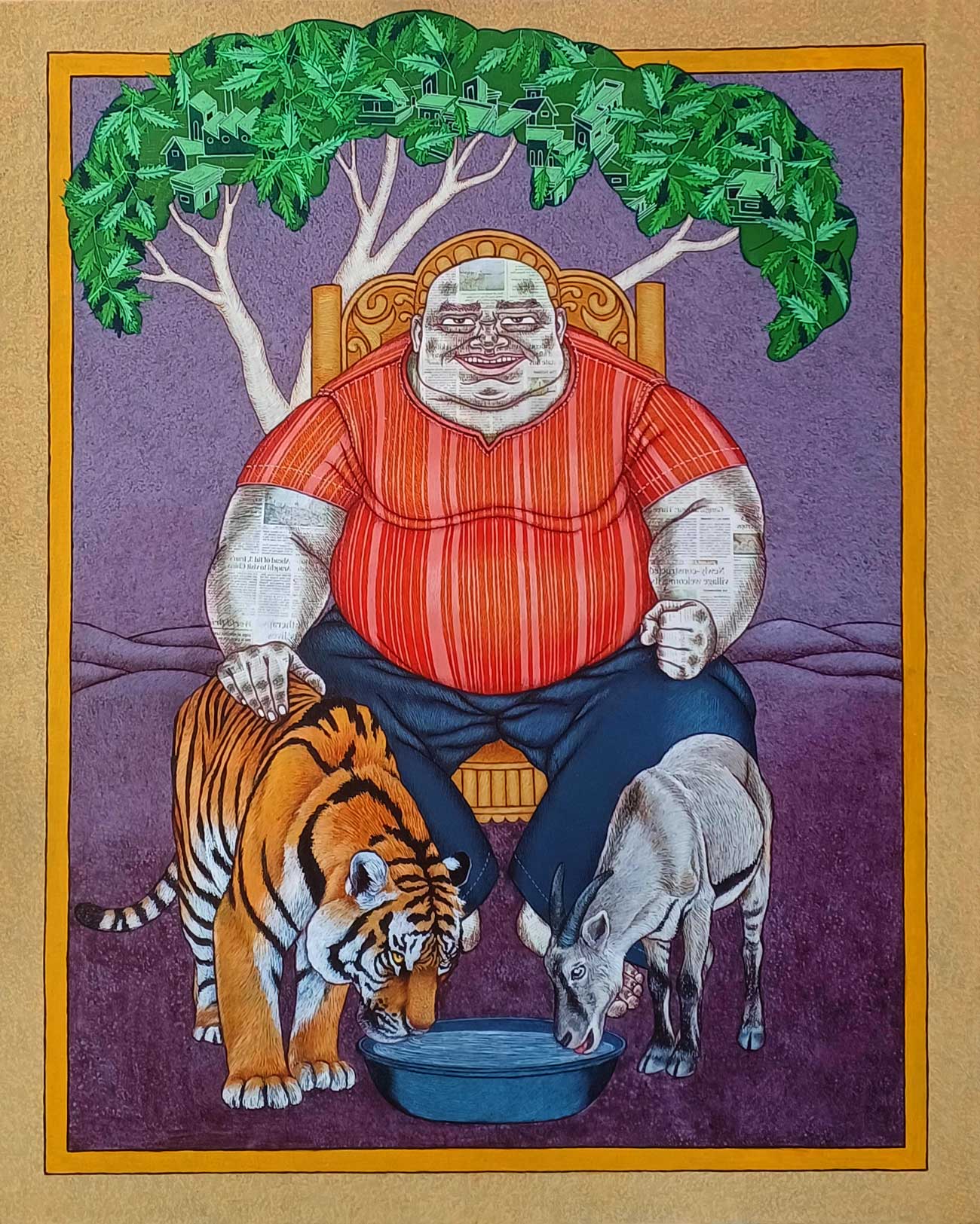 Dey believes that art cannot be apolitical, that it must have a specified standpoint. However, he does not want his art to be constrained under the labels of ‘radical’ or ‘anti-establishment’. The colours used, bold enough to stand out against the textured backgrounds, are an influence of the folk style of painting prevalent in his native state. Every element of Mrinal Dey’s artwork is a part of its narrative, including the empty spaces. In some paintings, the viewer is confronted by a man crouched inside a box, uncomfortably, trying to fit into a constrained space, symbolic perhaps of contemporary society. He attempts to expand his space on the limited canvas, yet, at the same time, seems to comment on the lack of it. Through the prism of artistic symbolism, Dey wittily reveals the fallouts of the contemporary world, usually disguised under capitalistic agendas.