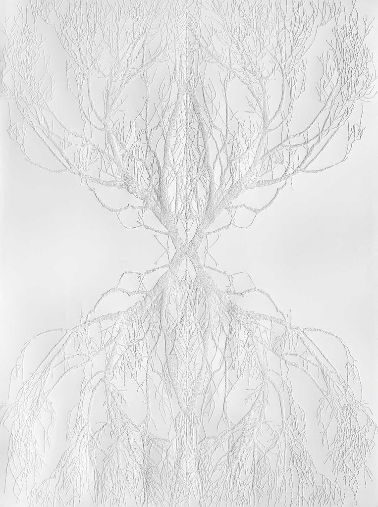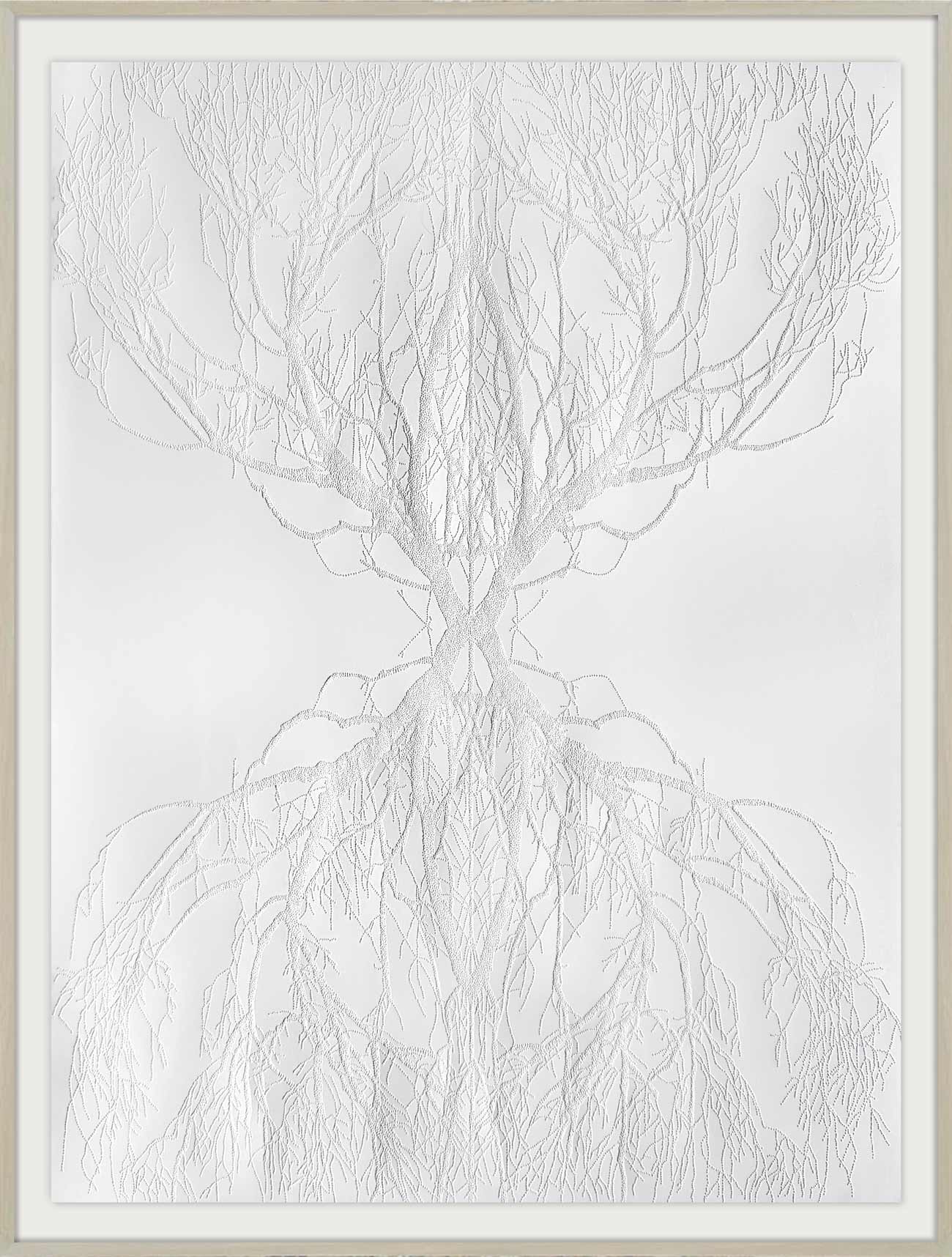 This work examines reflection not only as a visual phenomenon but as an interior state. Branching forms, resembling roots, veins, or pathways, mirror one another across the surface, evoking life’s recursive patterns. The composition suggests that the external world often echoes what resides within.