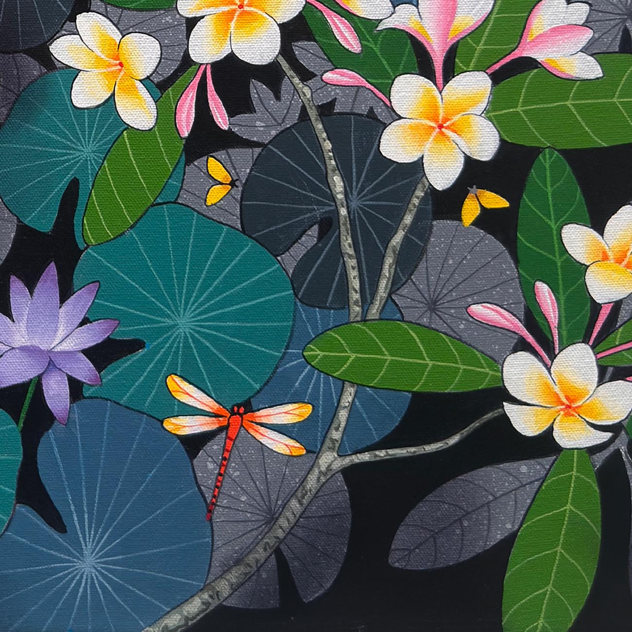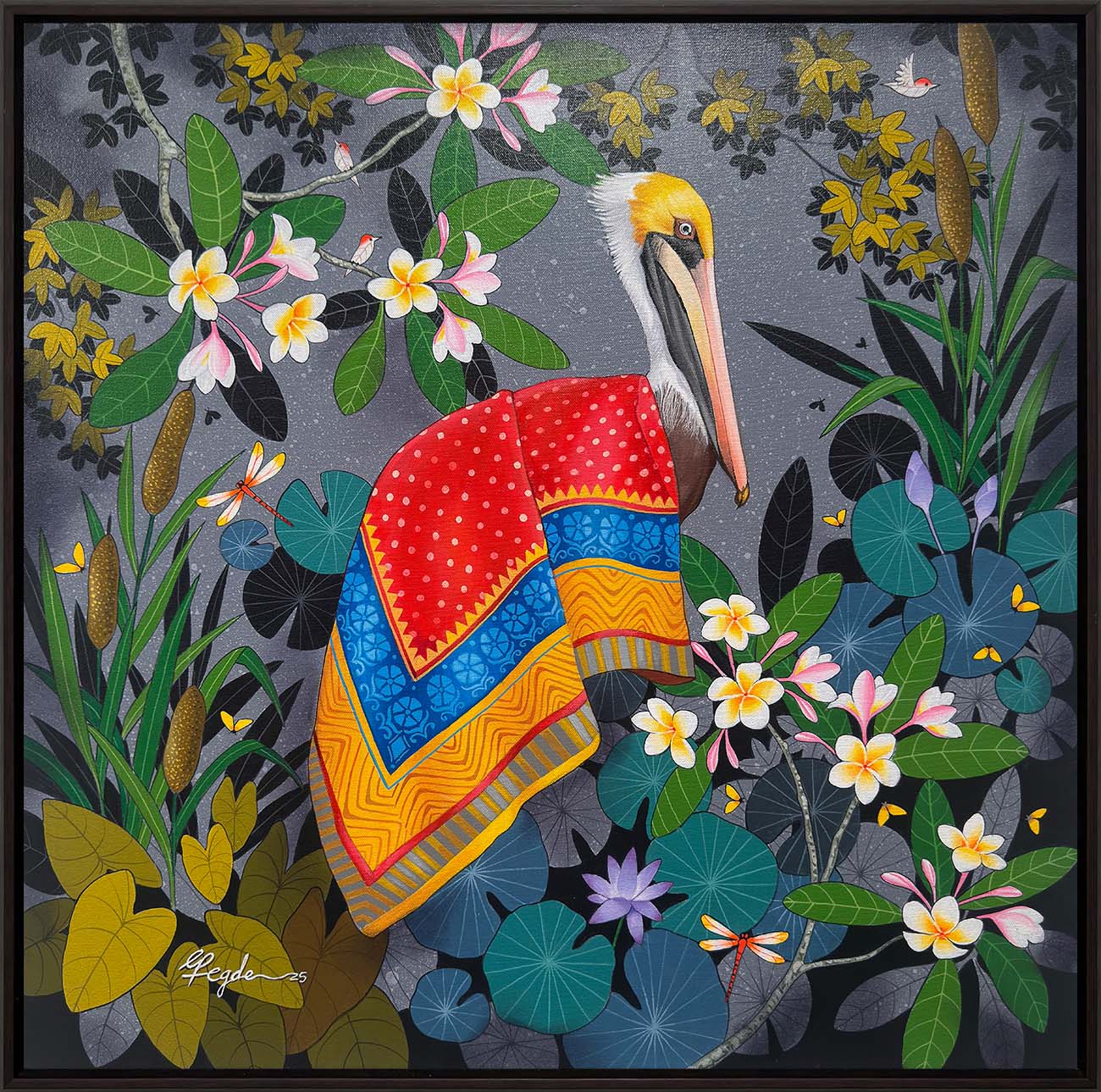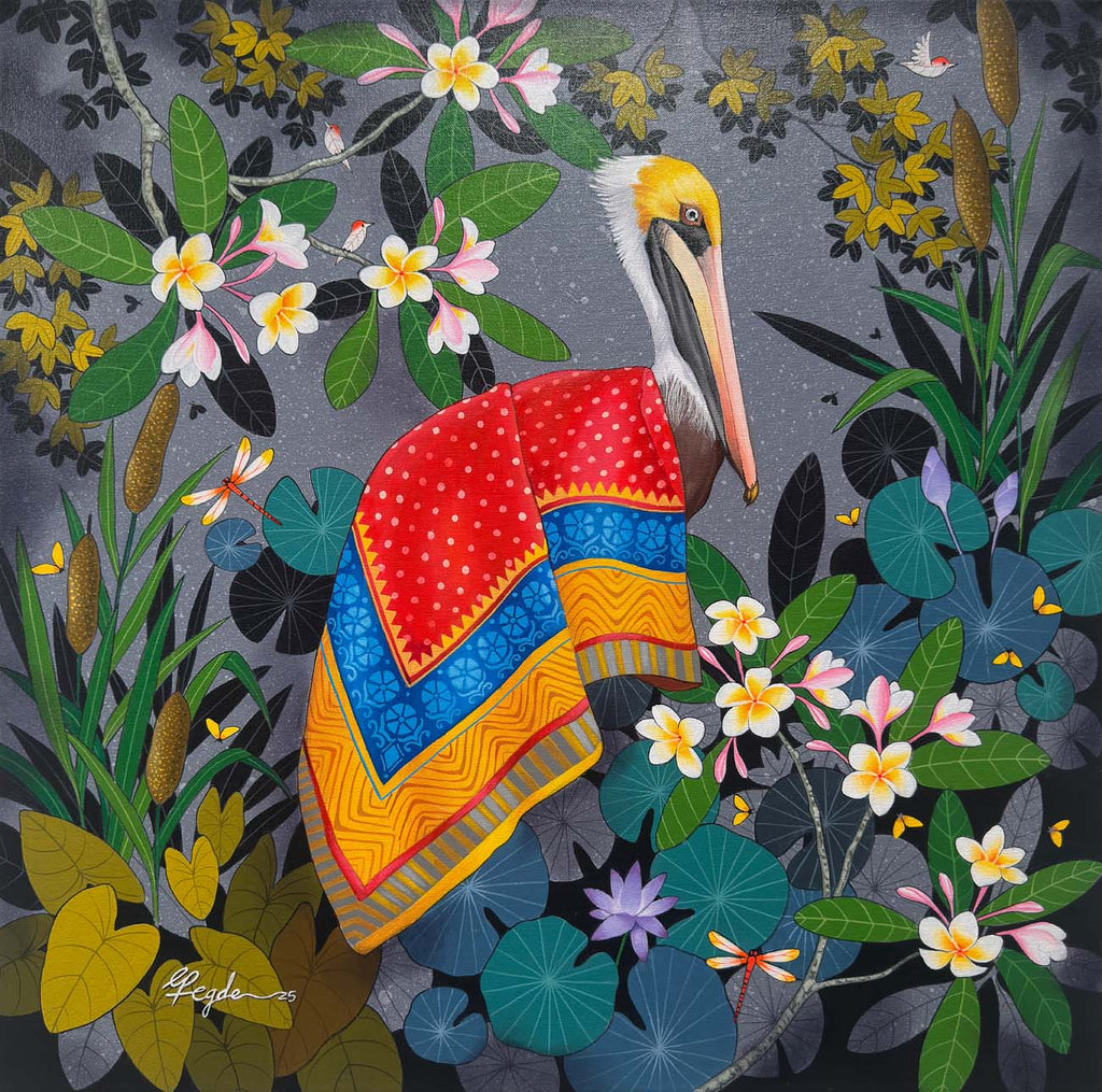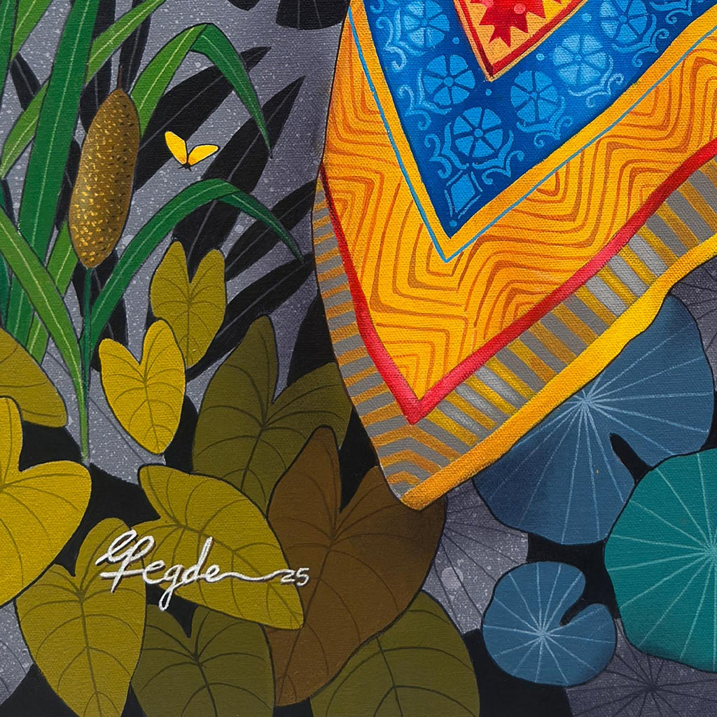 Contemporary artist Ganapati Hegde's artworks portray the rapturously green and radiant landscape of coastal Karnataka, where he grew up. Teeming with indigenous plants, flowers, birds, animals and insects, his paintings depict half-real, half-imagined worlds, layered with fantastical and unexpected elements. Hegde’s otherworldly jungle is peopled by nature’s assorted denizens, from caterpillars and chameleons to monkeys, butterflies and squirrels, along with a profusion of foliage painted in bright blues, reds, greens and lavenders. There is an undercurrent of fable-like storytelling that enlivens each work, compelling a viewer to unravel its varied perspectives.