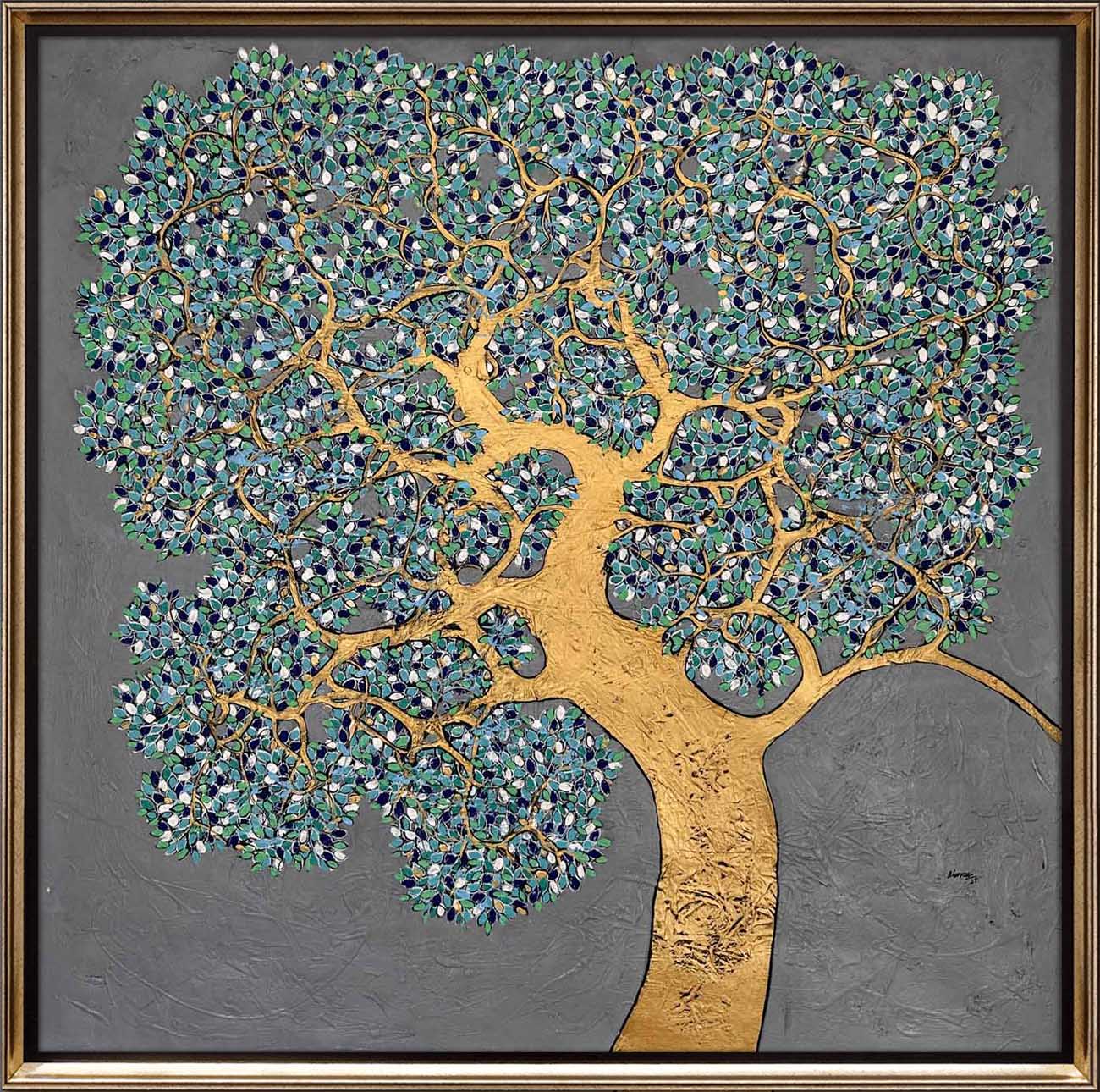 An instinctive artist, rather than pre-planning the scene or its effect, Bhaskara Rao paints layer by layer until he achieves a result he is contented with. His dynamic process is evident in his work, as the trees come alive on his canvases with a grand dimension of depth and realism. Rao achieves this using acrylic, layers of elaborate textures and imaginative colour schemes. Contrary to the expected shades of green, his paintings are often filled with bold primary colours, black and white, or even sombre greys, always elaborately detailed.