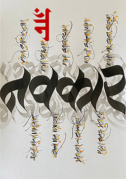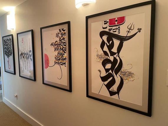 The client wanted 4 artworks depicting various gods and prayers that she believes in. Calligraphy artist Nikheel Aphale created a set of 4 complementary artworks depicting the Namokar Mantra from Jainism, Lord Shiva, the Gayatri Mantra, and Lord Ganesha.