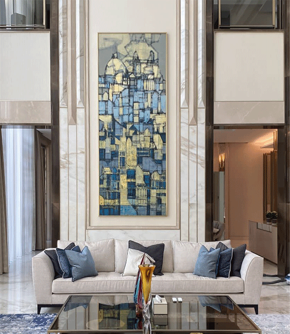 The client wanted a statement piece for her luxurious villa with a double height ceiling. Senior abstract artist Gurudas Shenoy worked with an unusual colour palette which was a departure from his regular style, to create a masterpiece.