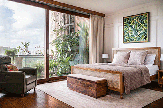 An interior designer wanted to add a touch of tradition to a contemporary Bangalore residence. This stunning Pichwai from Rajasthan featuring Lord Krishna holding a flute and surrounded by his beloved cows, was commissioned to complement the colour palette of the bedroom.