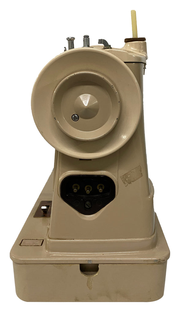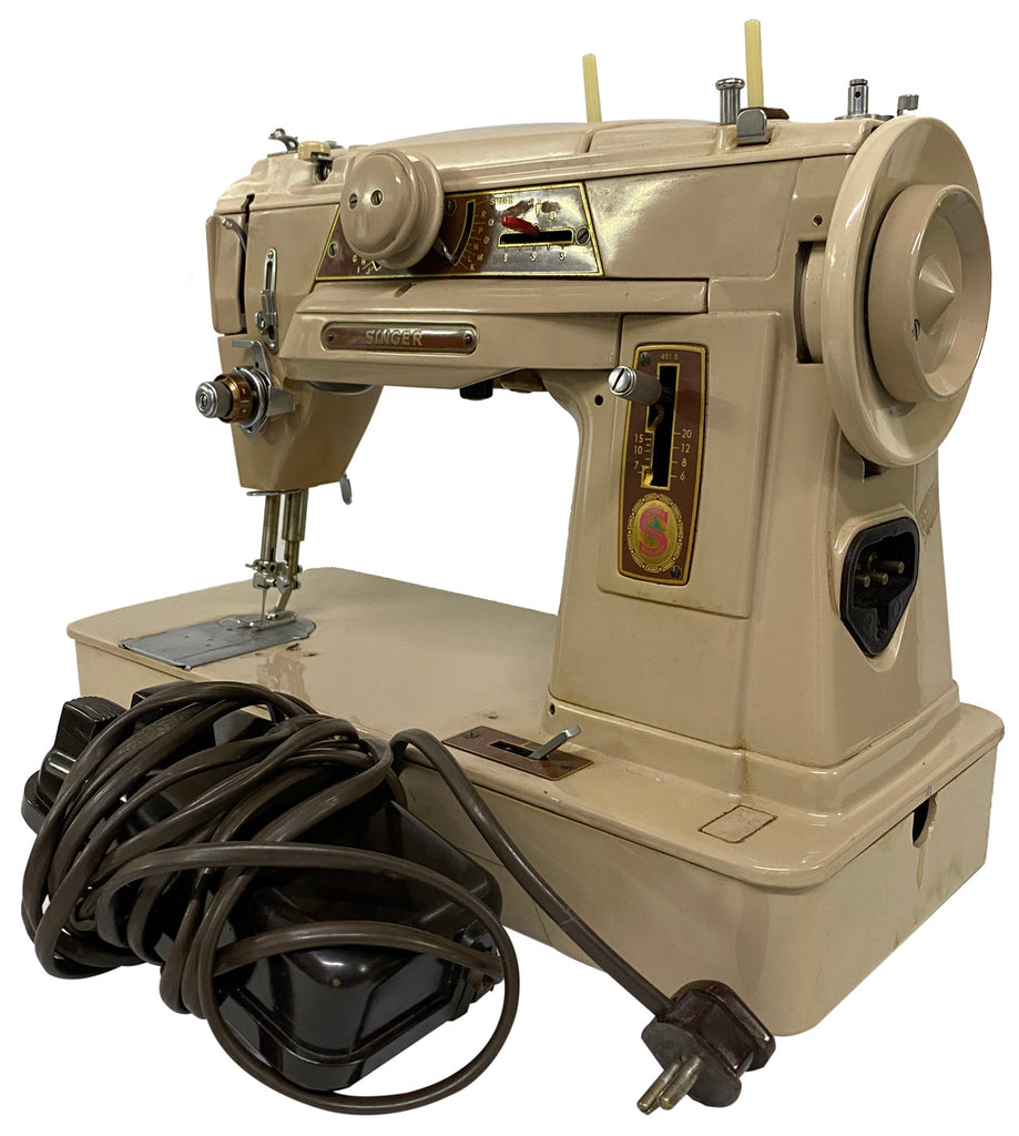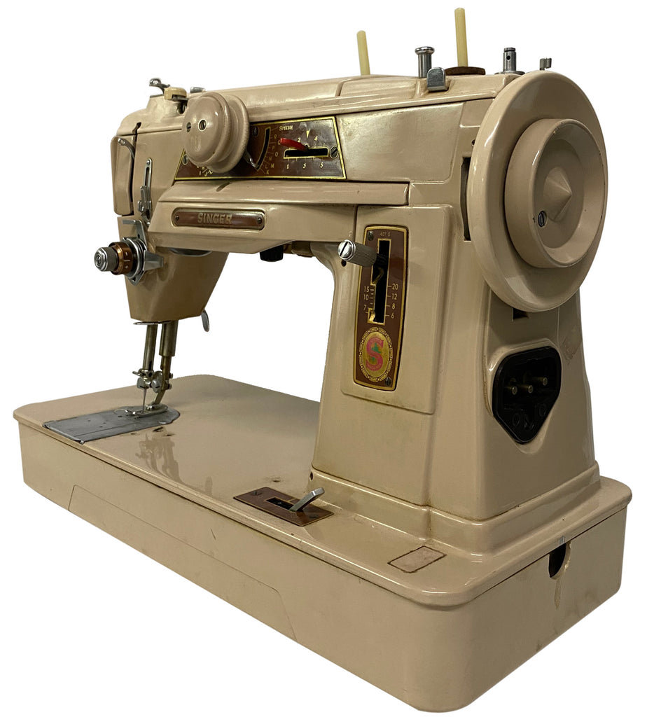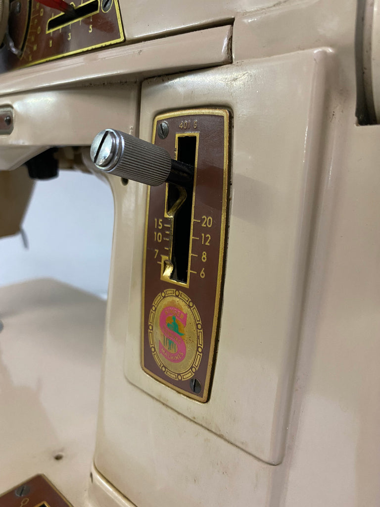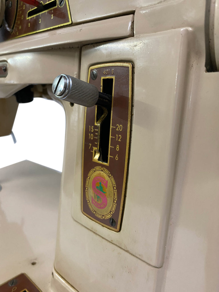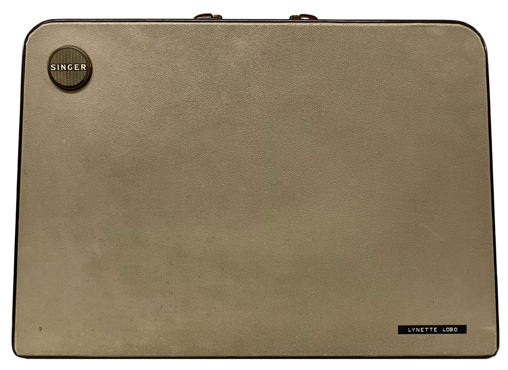 This German-made Singer sewing machine, model number 401G, is from the 1950s and comes with its original case. The statement beige case calls attention to the Singer logo dial in rich antique brown on the top left. On the bottom right, the name of a possible previous owner, Lynette Lobo is stuck on.