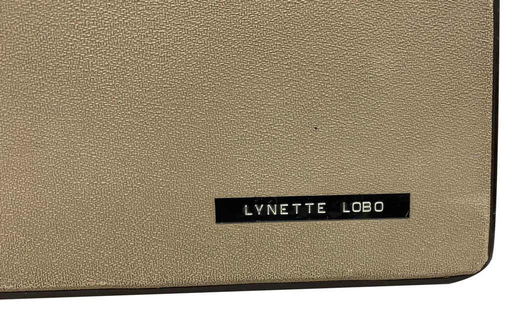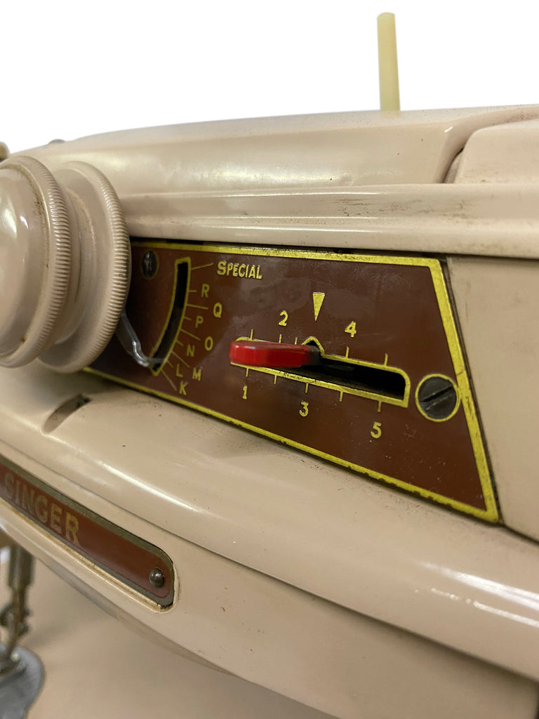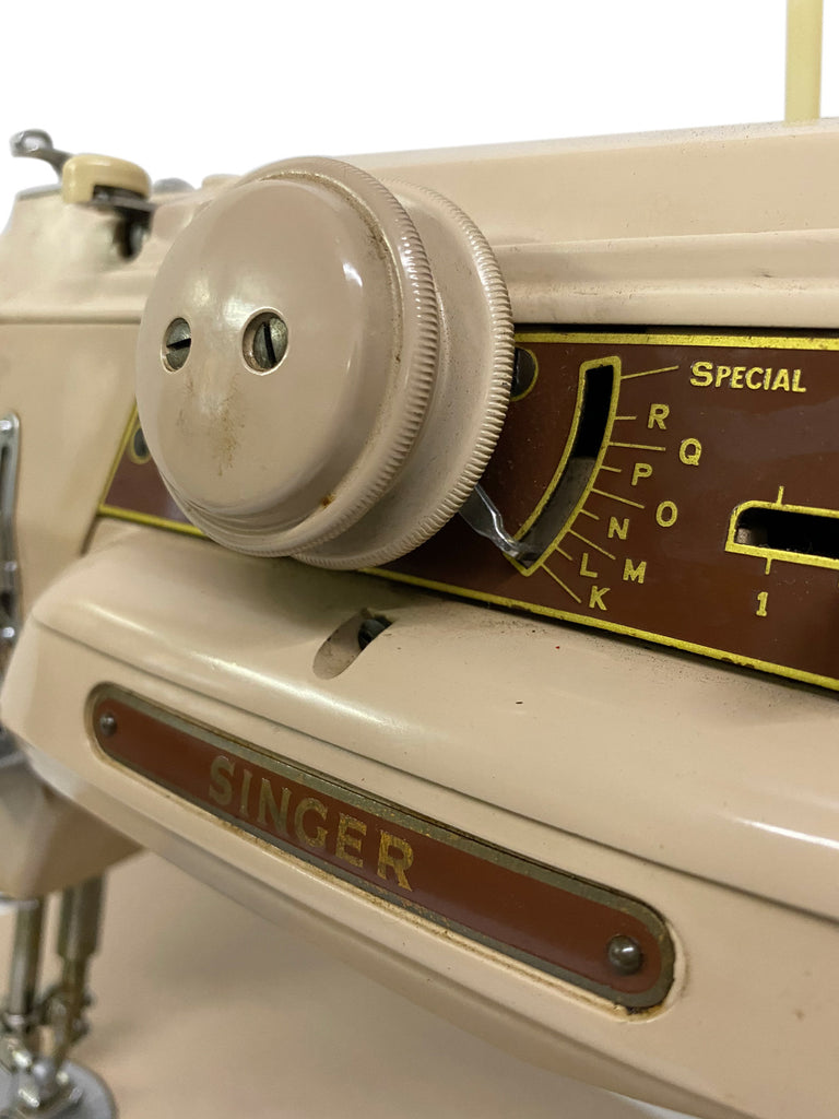 Read MoreThis German-made Singer sewing machine, model number 401G, is from the 1950s and comes with its original case. The statement beige case calls attention to the Singer logo dial in rich antique brown on the top left. On the bottom right, the name of a possible previous owner, Lynette Lobo is stuck on.