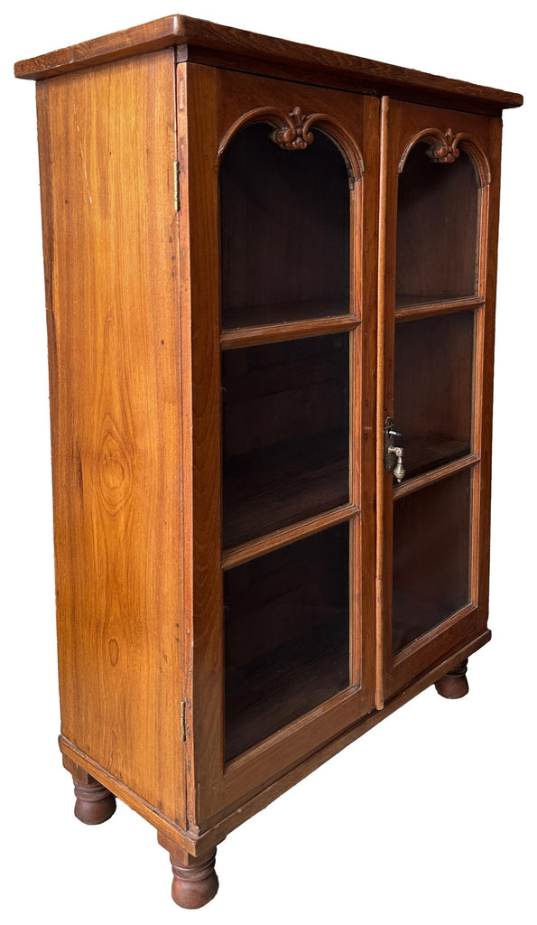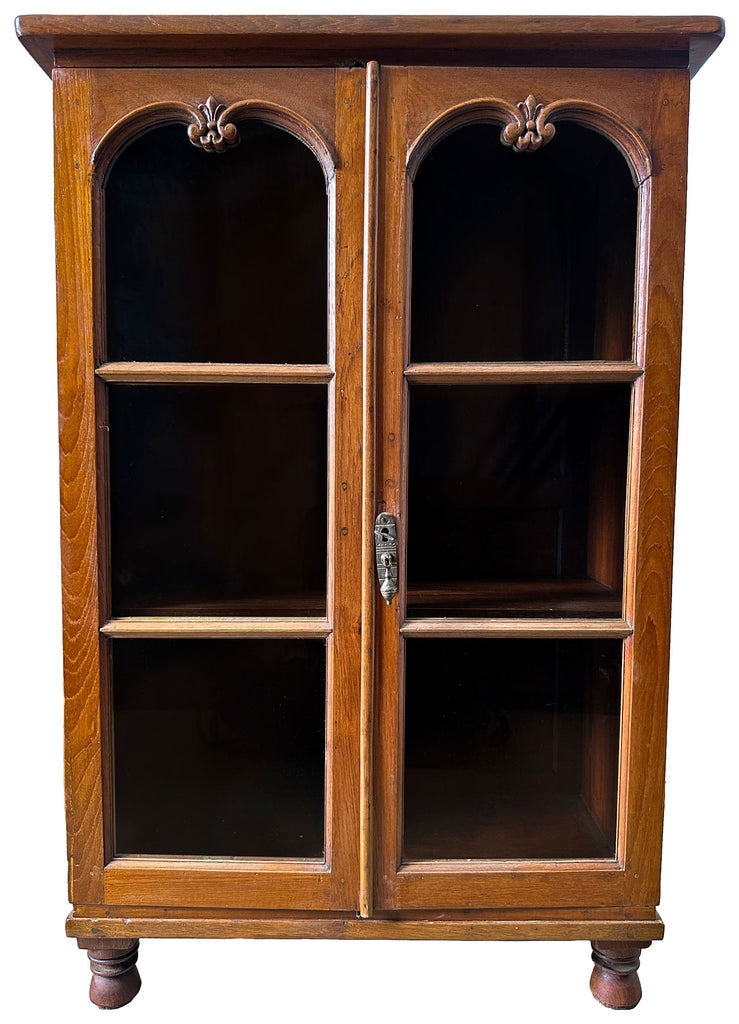 Read MoreArts and Crafts display cabinet in teak wood, with a glass front and turned legs from 1930s/40s. The cupboard has two shelves and brass fittings, including a brass drop handle and lock. This attractive cabinet could be used as a bookshelf or to display collectibles.