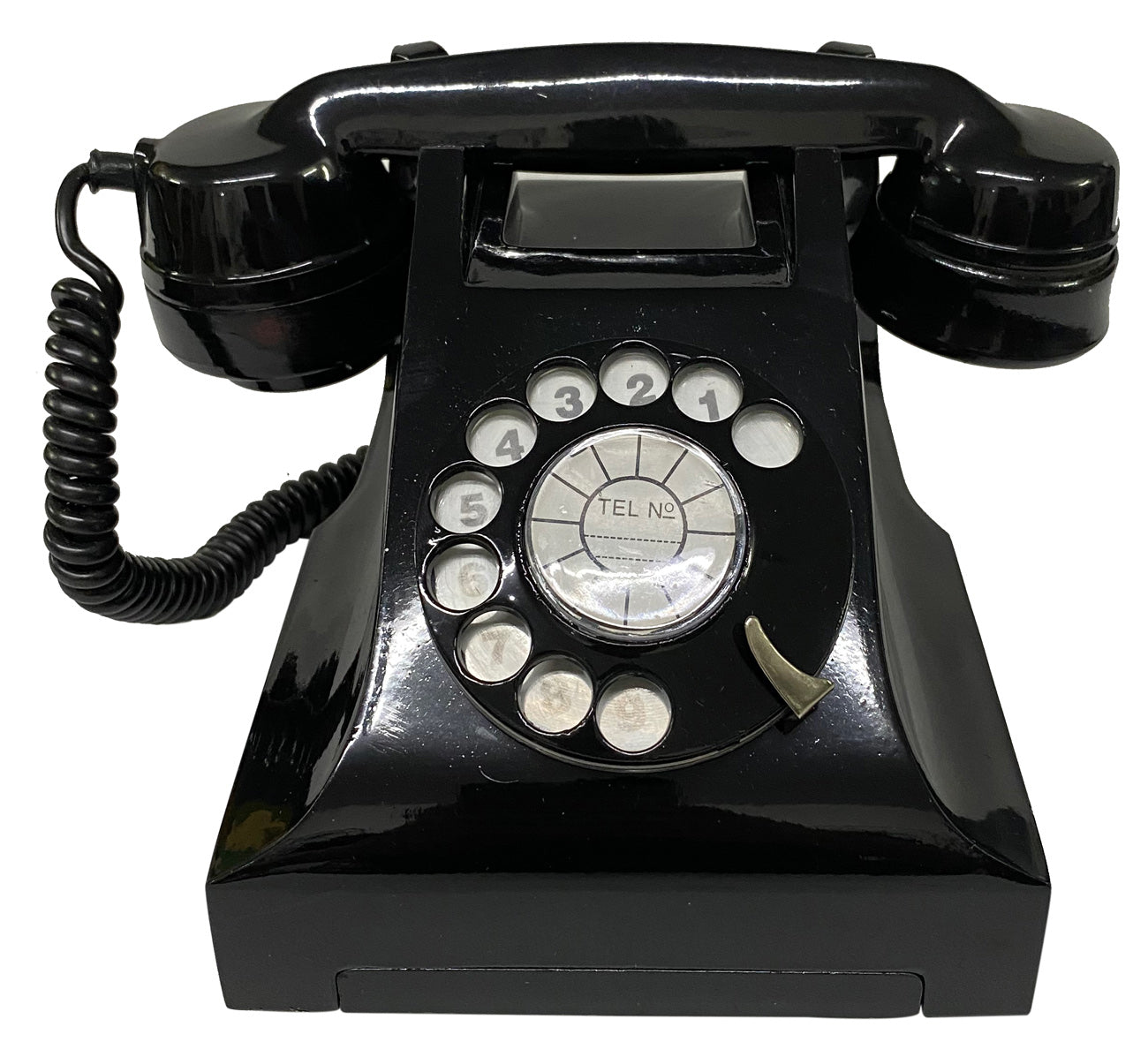 This classic bakelite ITI telephone brings back fond memories from the 1980-90s. It comes in mint condition, completely unused. All the components are fixed to the base plate. There are two air vents in the base and the feet are press fit. The dial strip is whirled in a circular manner, starting at the lower right and anti-clockwise, while the terminal end of the strip is left unnumbered.