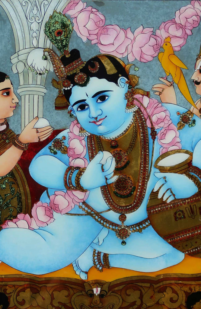 Infant Krishna is shown seated on a jewelled throne with his right hand holding a ball of butter, and his left hand on the armrest. Krishna, naked but for his sumptuous jewellery, sits in a hall defined by pillars and a floral garland hanging from the ceiling. As always, Krishna is portrayed as a chubby child, a part of his hair tied in a topknot, adorned by jewels and the characteristic peacock feather. Unusual for this genre, he is depicted in blue. He is flanked by two elegantly dressed and bejewelled attendants, one ready to hand him more butter, while the other stands holding a parrot. In the foreground is a capacious bowl filled with fruit.