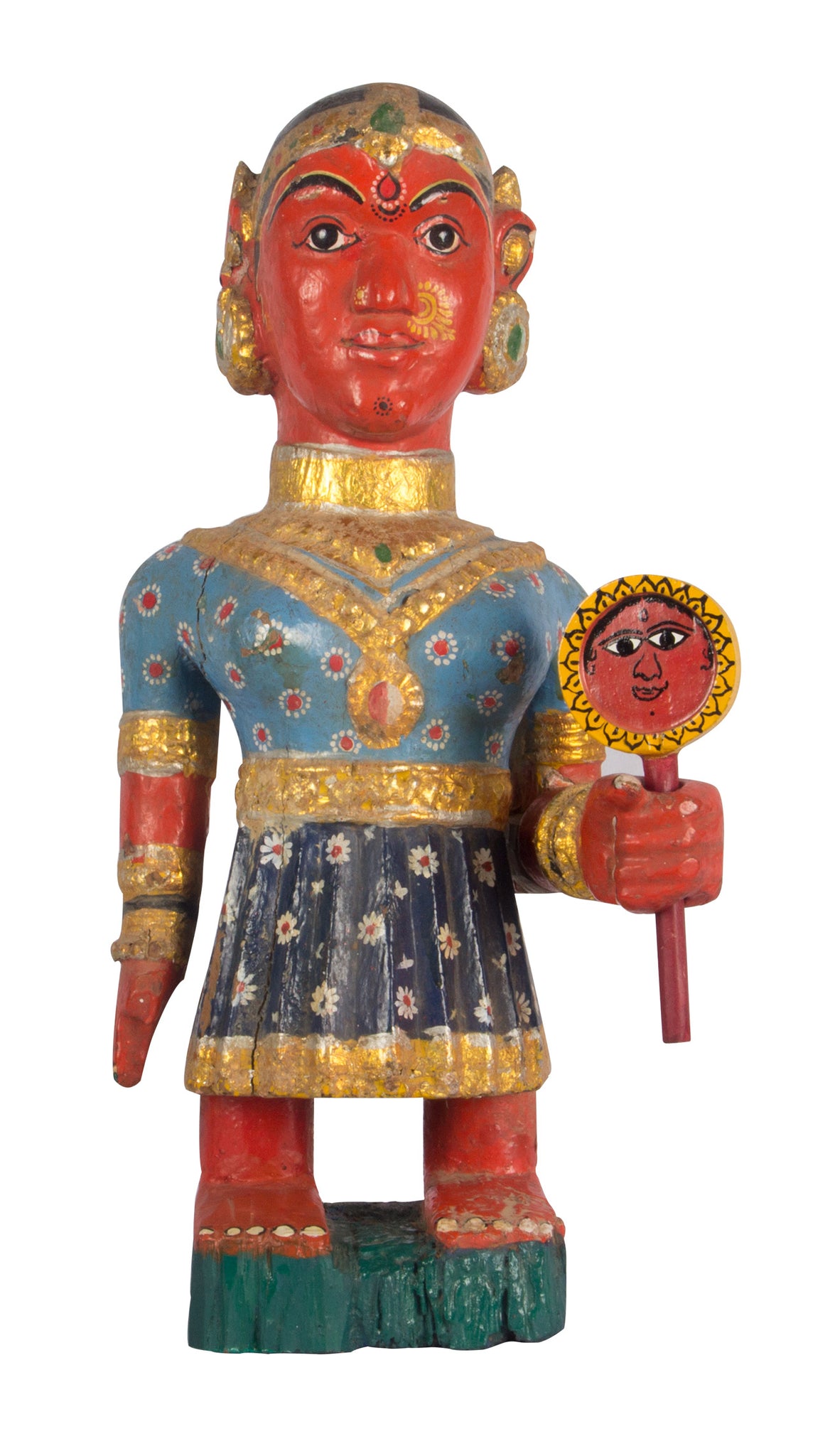 This rare collectible of a Bhuta lady is most likely from Mangalore. Painted in bright colours, this wooden piece is in a good condition. There is a small crack down the figure’s left shoulder and the left side of the skirt.