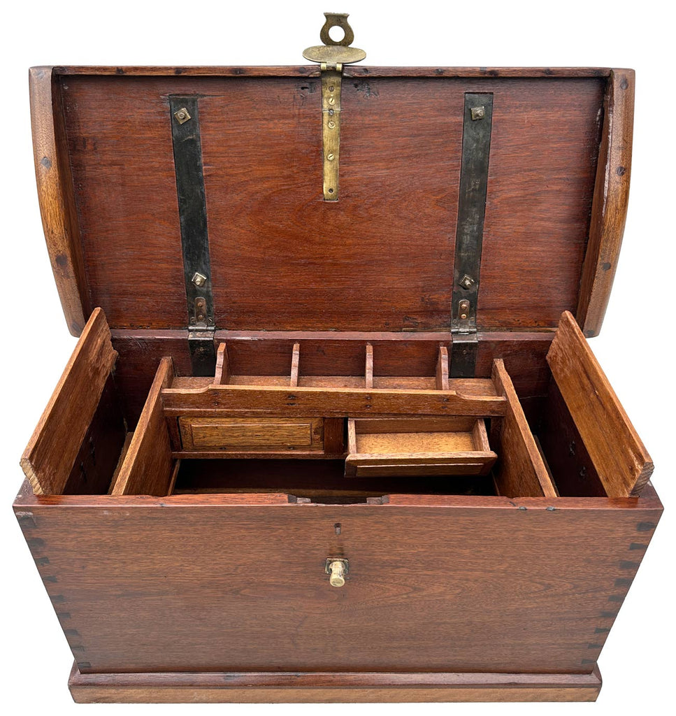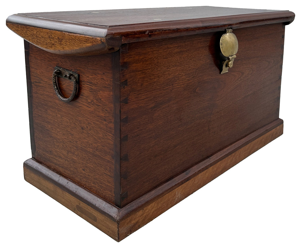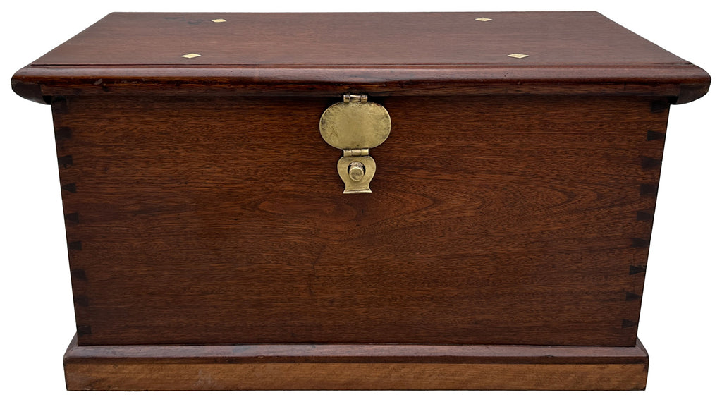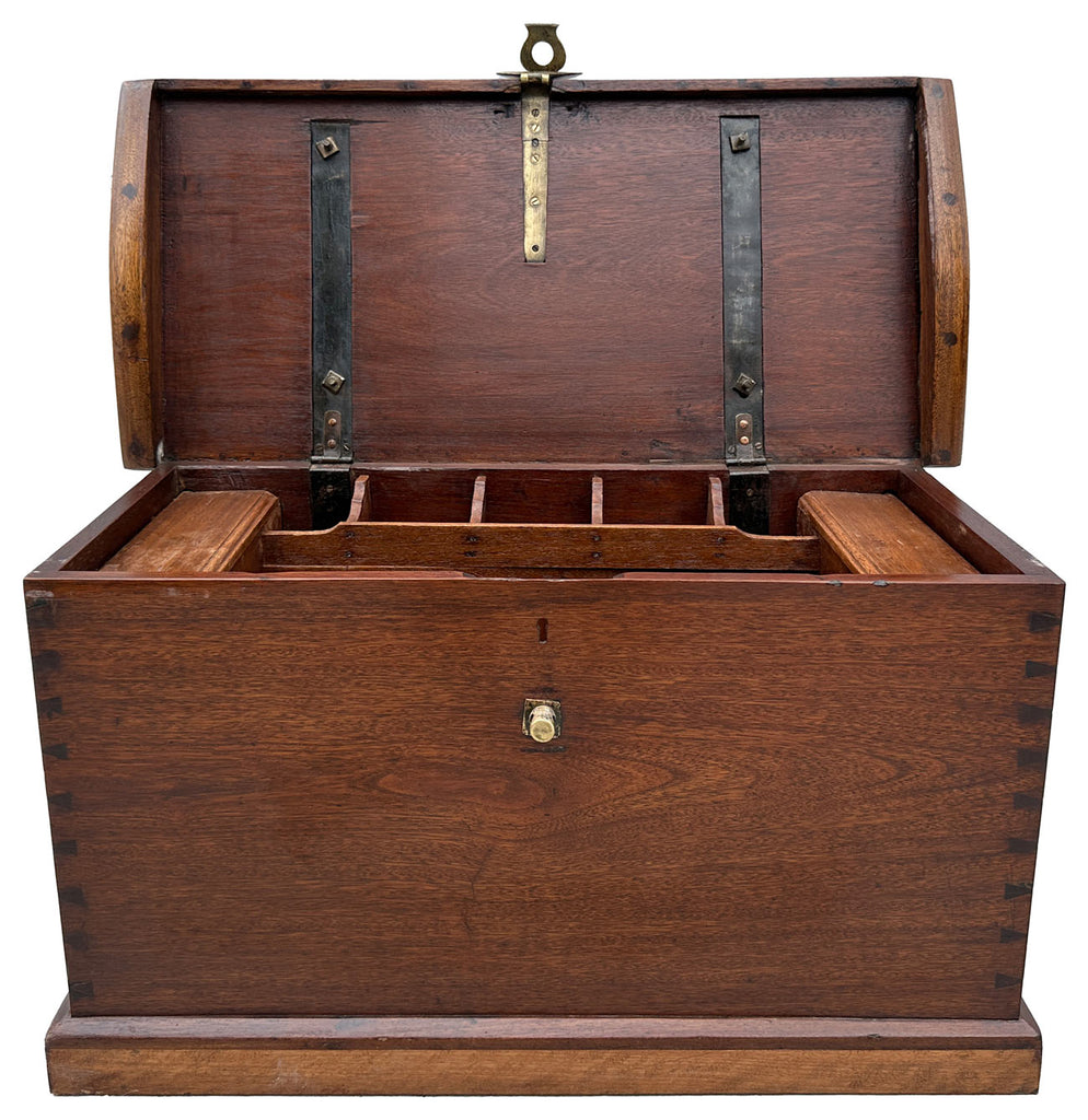 Burmese jackwood gong latch chest. It has iron handles and a delicate repeating detail of bow tails at the corners. The gong latch itself is brass, and inside, the lid has iron straps for strength. The storage has two lidded compartments on either side, with a large storage space in the centre, as well as smaller compartments and pigeon shelves.