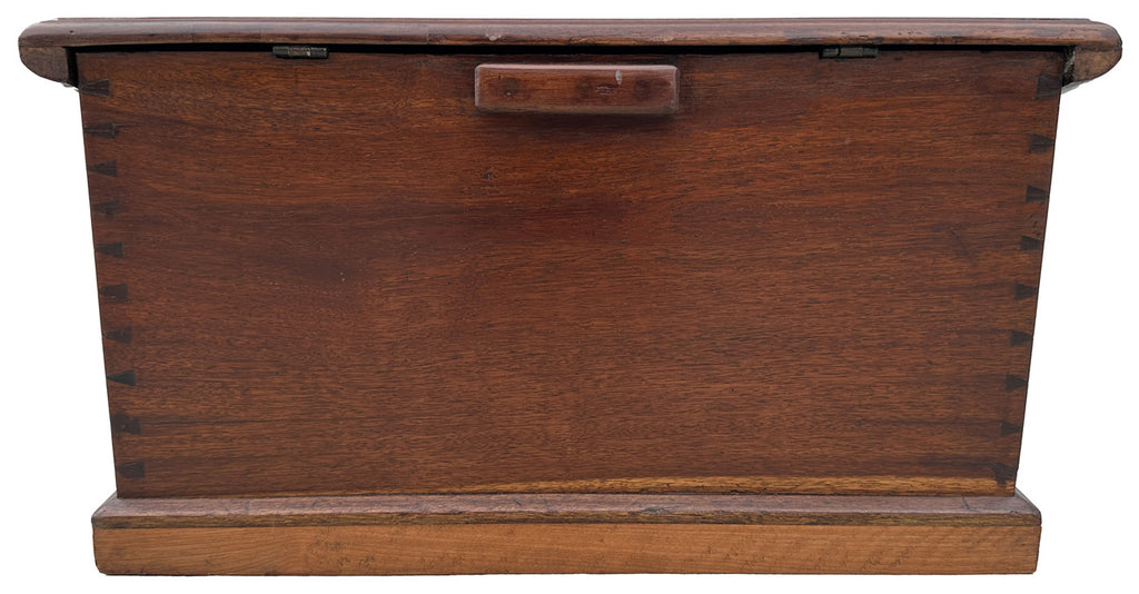 Read MoreBurmese jackwood gong latch chest. It has iron handles and a delicate repeating detail of bow tails at the corners. The gong latch itself is brass, and inside, the lid has iron straps for strength. The storage has two lidded compartments on either side, with a large storage space in the centre, as well as smaller compartments and pigeon shelves.