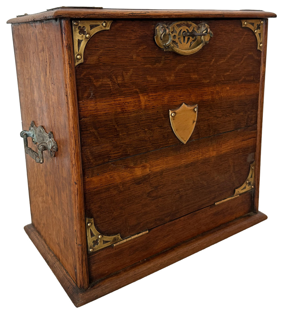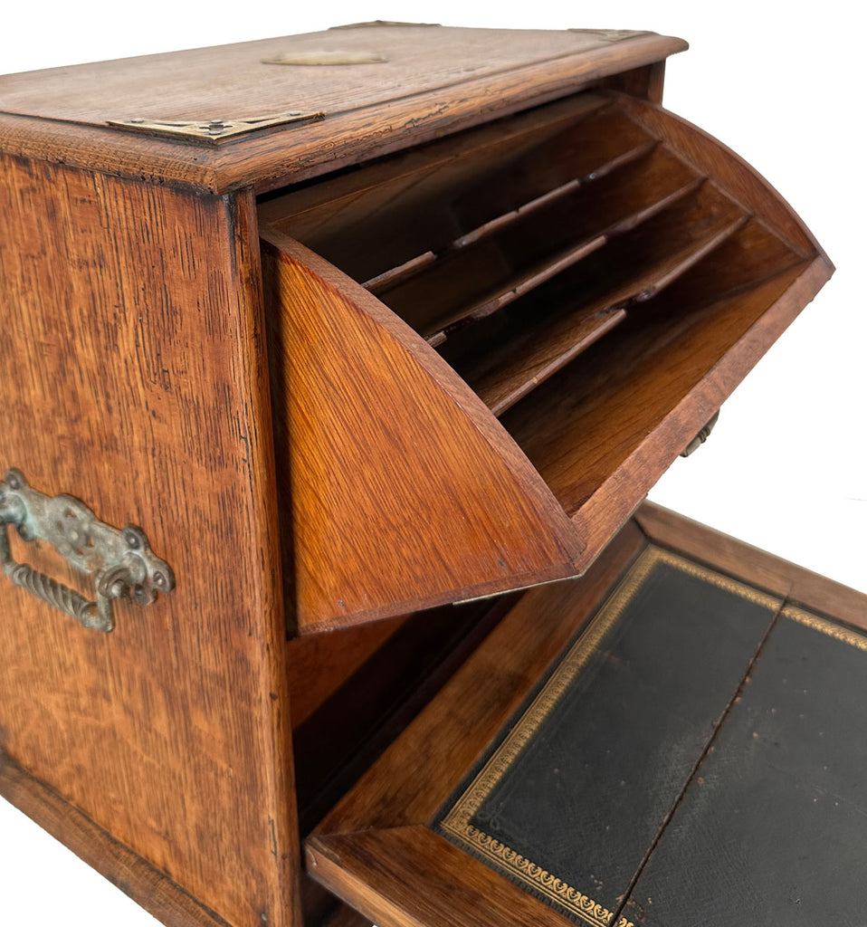 Read MorePortable oak Campaign desk or writing slope from England. These were designed for travel and storage, and often associated with military campaigns. The front drops down to form a writing slope with a leather centre. For storage of papers, envelopes etc., the top hinges down to reveal slotted filing compartments.