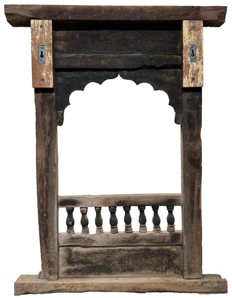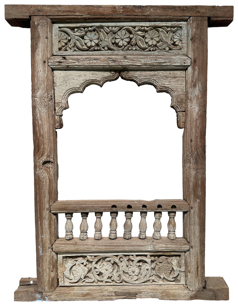Read MoreDeccan teak, painted window. The top panel is carved in foliate scrollwork interspersed with flowers. The cusped arch at the top is reminiscent of Mughal architecture, and below this is a small balustrade. The base panel also has scrollwork foliate in the centre, and at the sides are carved two Hamsas.