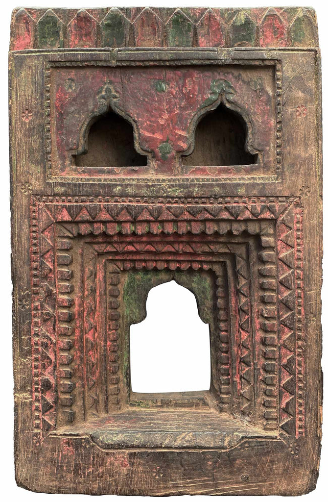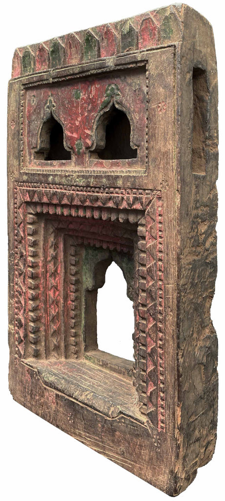 Read MoreThis is a small Deccan hand-carved wooden window from North Karnataka. These small windows kept the heat out of homes, and no one could get in even without bars and glass. The window has been beautifully carved in the Deccan confluence of Persian, Mughal and local traditions. The cusped arches are reminiscent of Mughal architecture, and the multiple door jams of temple architecture. At the top are rounded battlements very similar to Deccan forts. The frame is painted in beautiful soft pink and green vegetable colours.