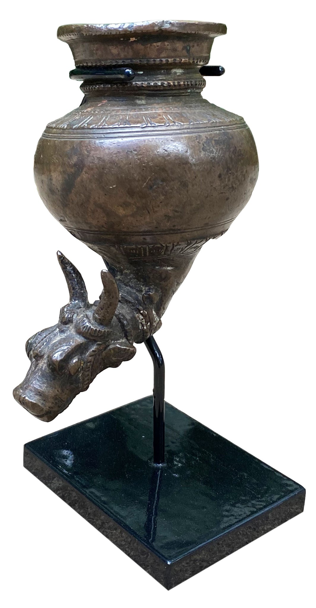 Used for the devotional ritual of abhishekam, which involves the pouring of a liquid offering on a deity, this dhara patra is an unusual collectible. With a Nandi (bull) as the spout, this dhara patra was most likely used to pour offerings on a Shivalinga. Made of brass, it comes displayed on a hand-made wooden stand.