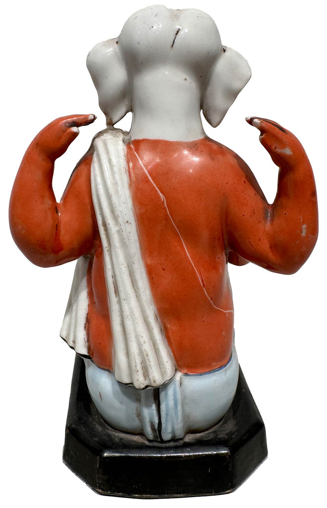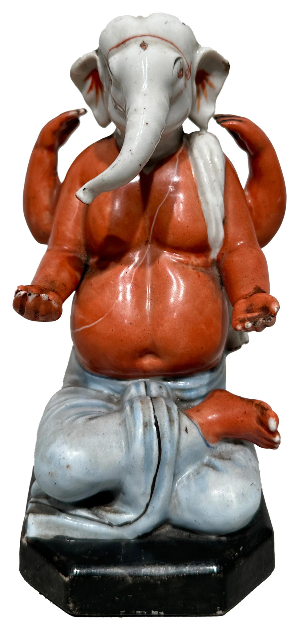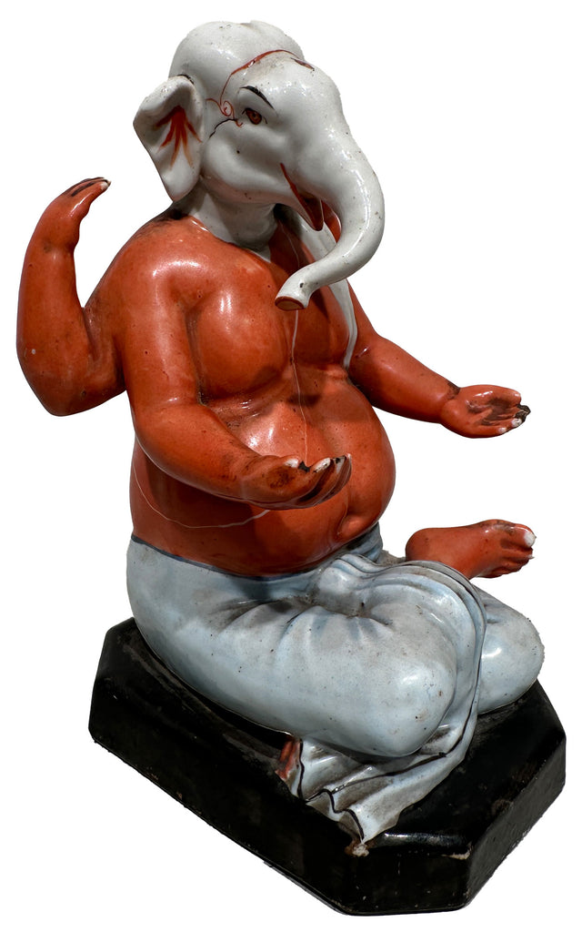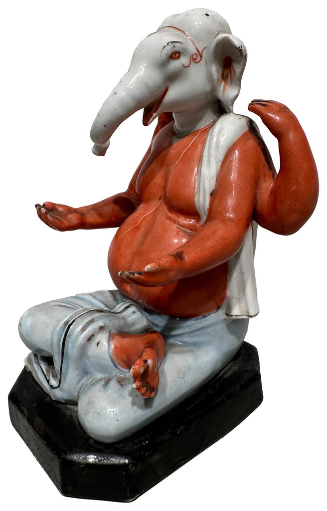 Porcelain Ganesha made in Germany, most probably by B. Rigold & Bergmann. Ganesha, also known as Ganapati and Ganesh, is one of the most loved and worshipped deities in the Hindu pantheon. He is the god of new beginnings, remover of obstacles, bestower of favours and granter of success.