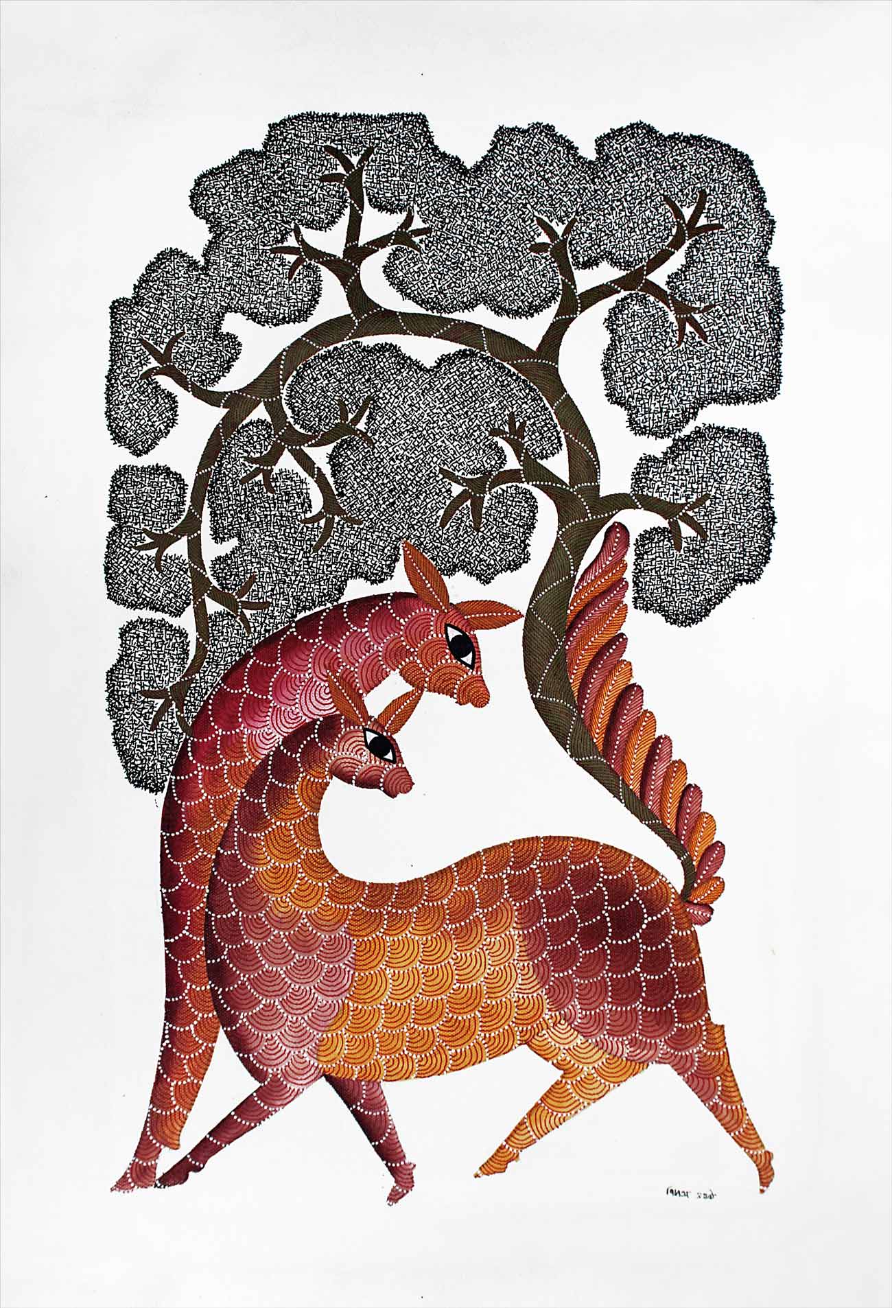 Jangarh Singh Shyam was India’s most noted Gond artist, who passed away in 2001. Several members of his family are renowned Gond artists, including his wife, Nankusia Shyam, children Mayank Shyam and Japani Shyam, brother in law Subhash Vyam and his wife, Durga Bai.