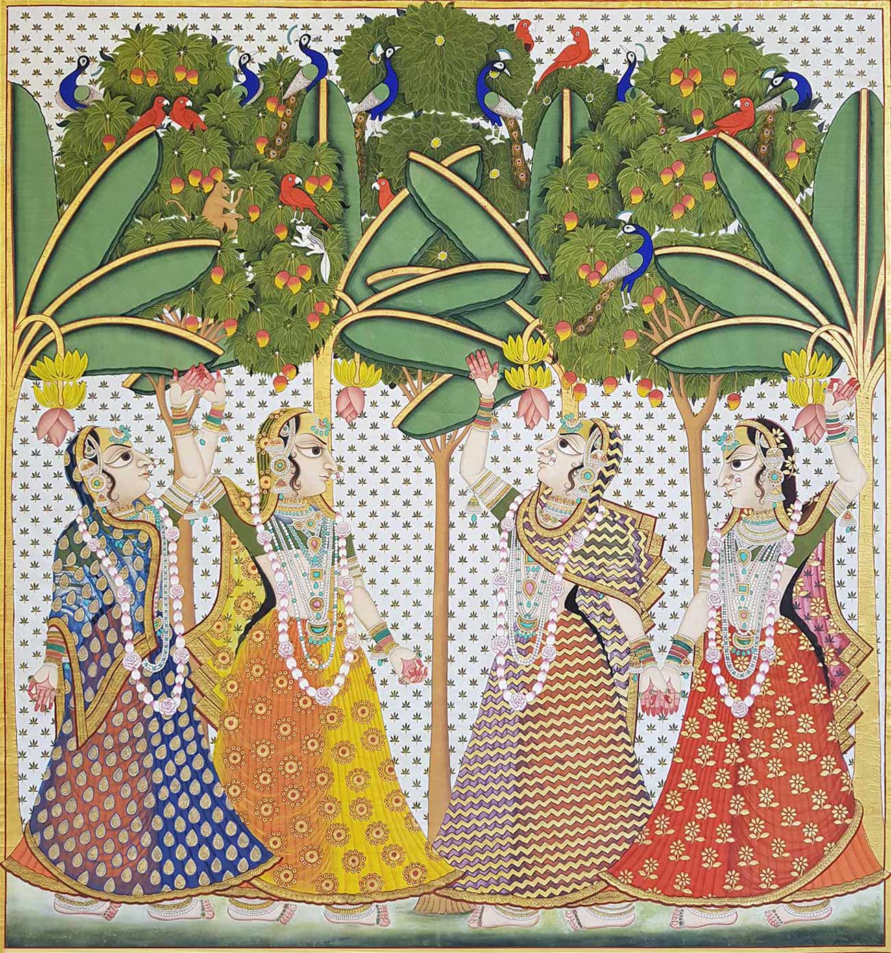 In this artwork, Lord Krishna is represented by the trees in the painting. While an uncommon depiction, the peacocks and lotuses seamlessly blending into the tree indicate the connection with Krishna.