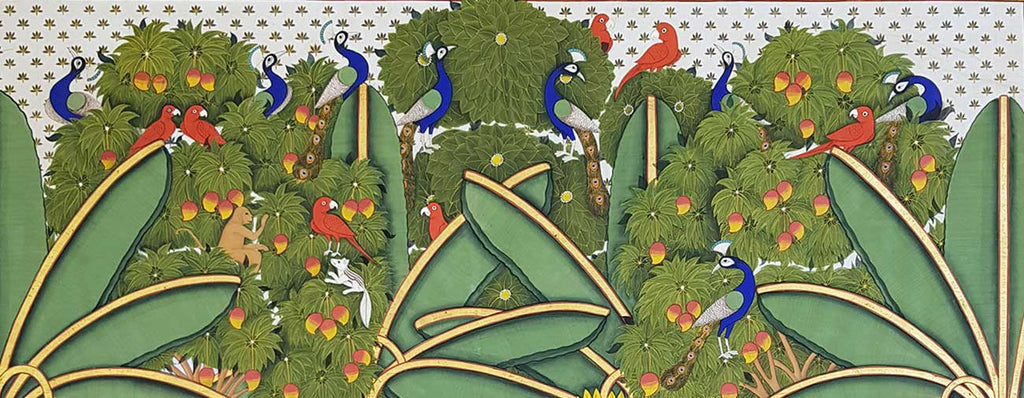 Read MoreIn this artwork, Lord Krishna is represented by the trees in the painting. While an uncommon depiction, the peacocks and lotuses seamlessly blending into the tree indicate the connection with Krishna.