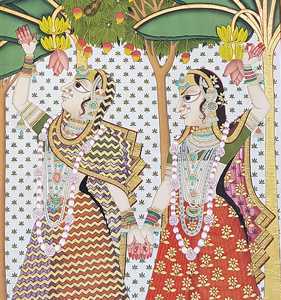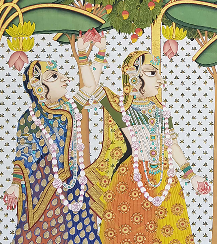 Usually, Pichwais don’t carry an artist’s signature because each artwork is created by a group of artists. However, when a Pichwai is created by an acclaimed or senior master artist, he may add his signature on to it. This artwork carries the signature of renowned Pichwai artists, Nitin and Nilesh Sharma, hence increasing its value.