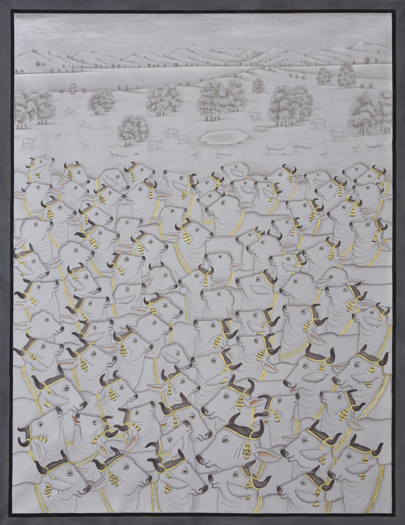 Read MorePichwai (pichvai) is a style of painting that originated over 400 years ago, in the town of Nathdwara near Udaipur in Rajasthan, India. Intricate and visually stunning, pichwai paintings, made on cloth, depict tales from Lord Krishna's life. Creating a pichwai can take several months, and requires immense skill, as the smallest details need to be painted with precision. Lord Krishna is often depicted as Shrinathji in Pichwais, which is the deity manifest as a seven-year-old child. Other common subjects found in pichwai paintings are Radha, gopis, cows and lotuses. Festivals and celebrations such as Sharad Purnima, Raas Leela, Annakoot or Govardhan Puja, Janmashtami, Gopashtami, Nand Mahotsav, Diwali and Holi are frequently depicted in Pichwais.